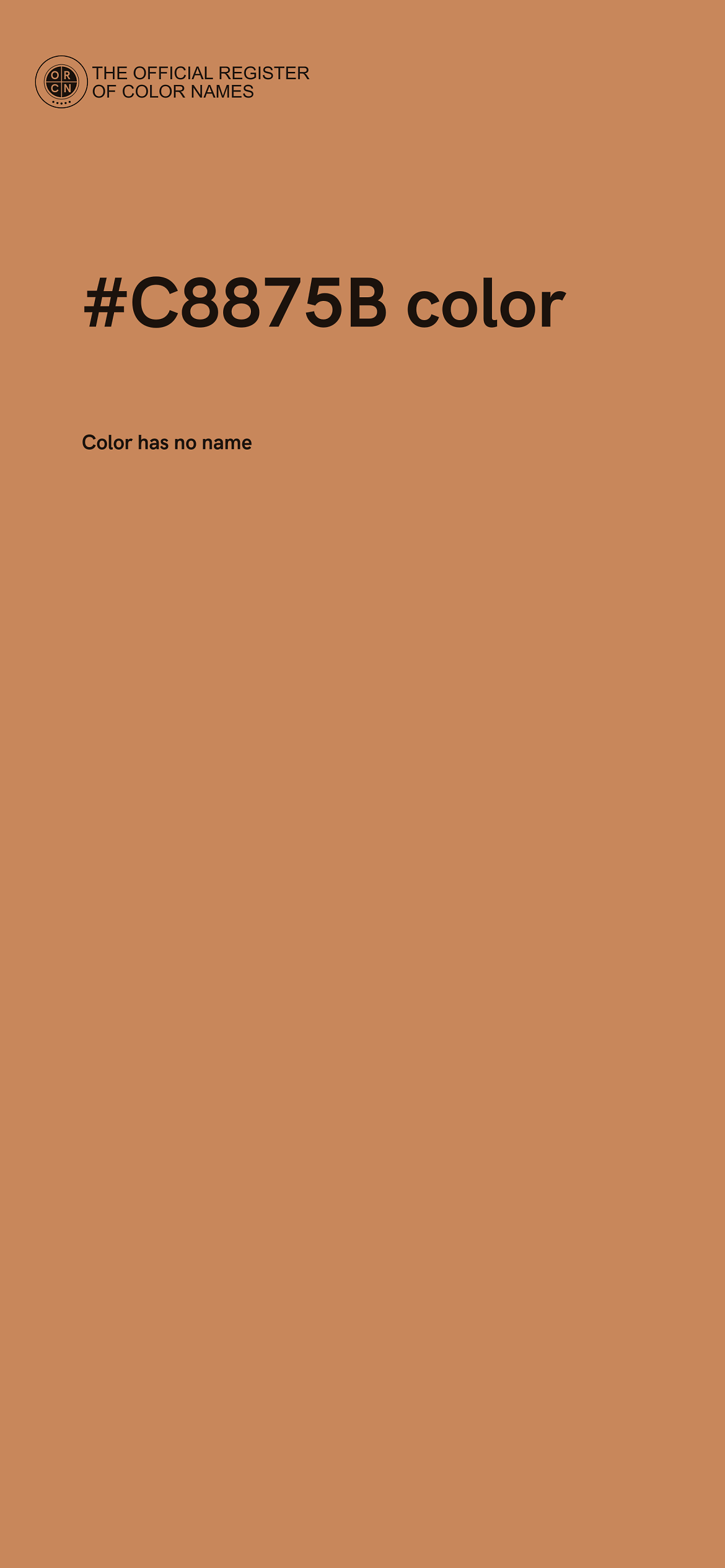 For printing in non digital world, #C8875B is represented in CMYK as 0 Cyan, 25 Magenta, 43 Yellow, and 22 Black (Key) (C:0 M:25 Y:43 K:22).