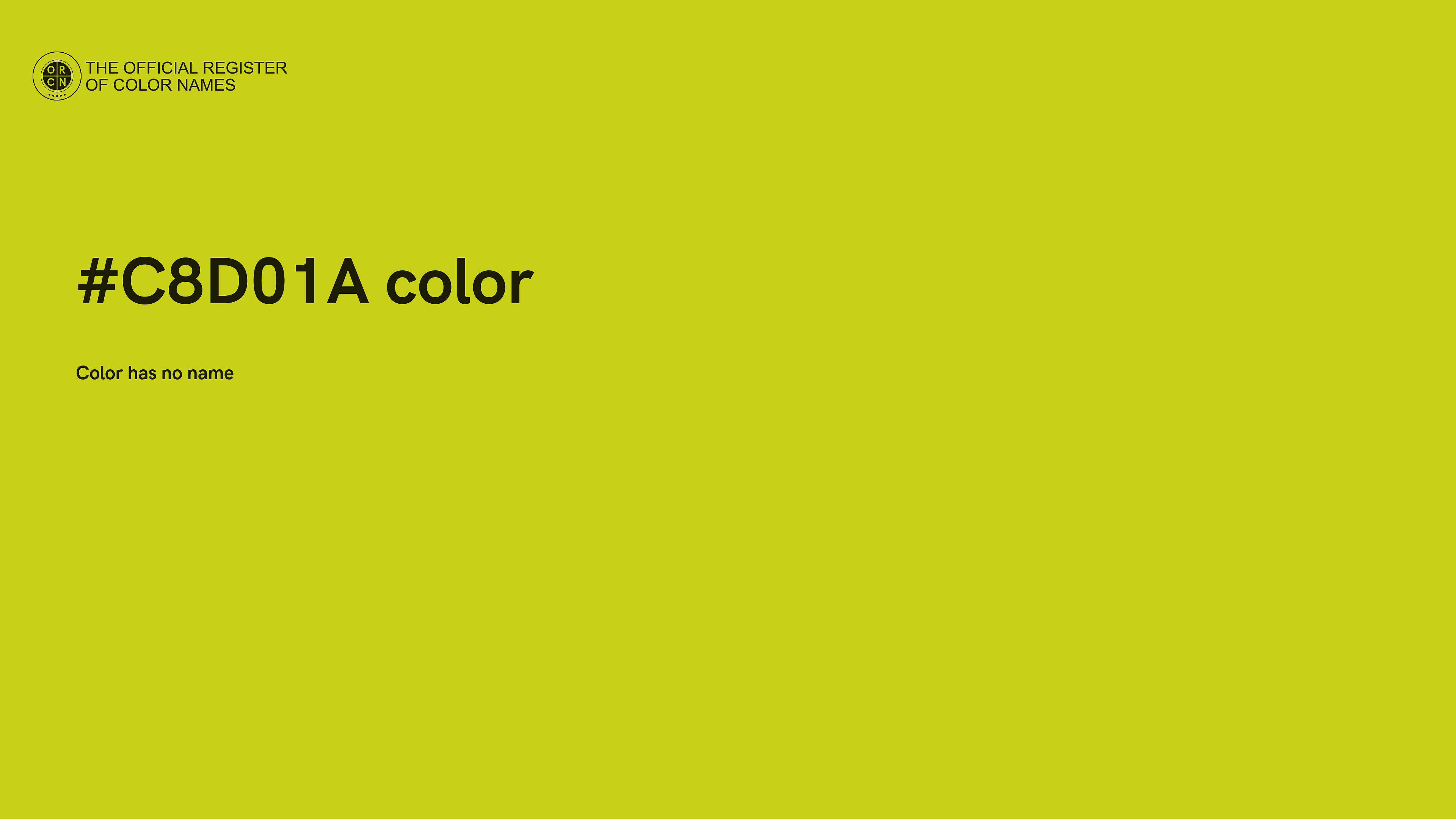 For printing in non digital world, #C8D01A is represented in CMYK as 3 Cyan, 0 Magenta, 71 Yellow, and 18 Black (Key) (C:3 M:0 Y:71 K:18).