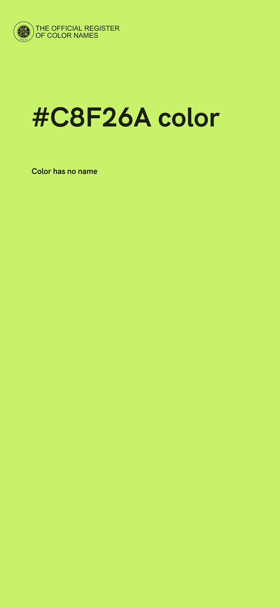 The digital color HEX #C8F26A belongs to the Chartreuse Color Family featuring High Saturation (Saturation Family) and Very Light (Brightness Family).