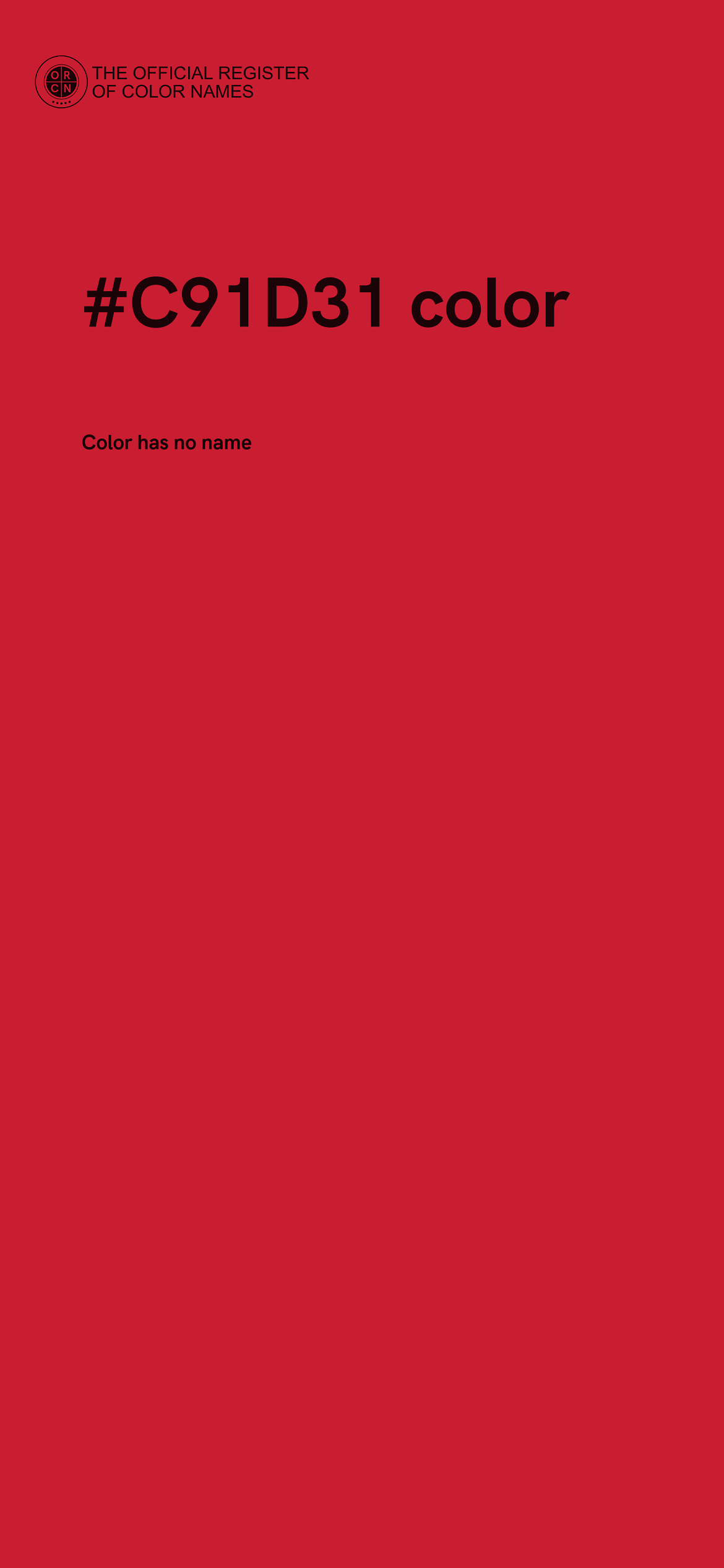 The digital color HEX #C91D31 belongs to the Red Color Family featuring High Saturation (Saturation Family) and Light (Brightness Family).