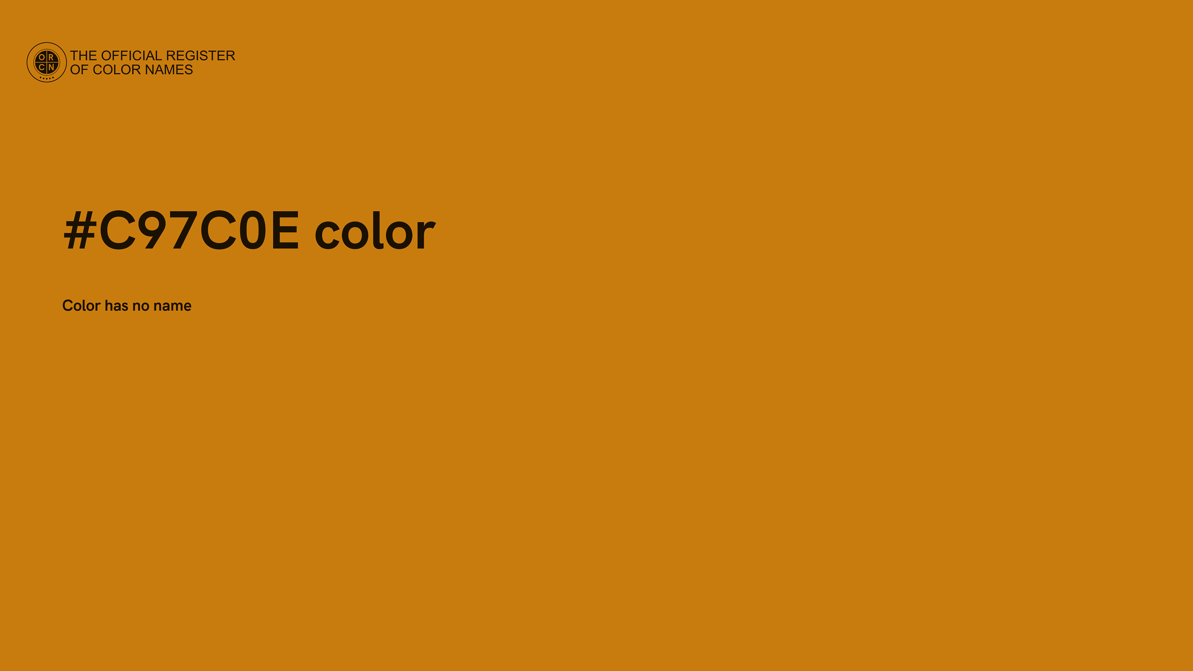 The digital color HEX #C97C0E belongs to the Orange Color Family featuring Full Saturation (Saturation Family) and Light (Brightness Family).
