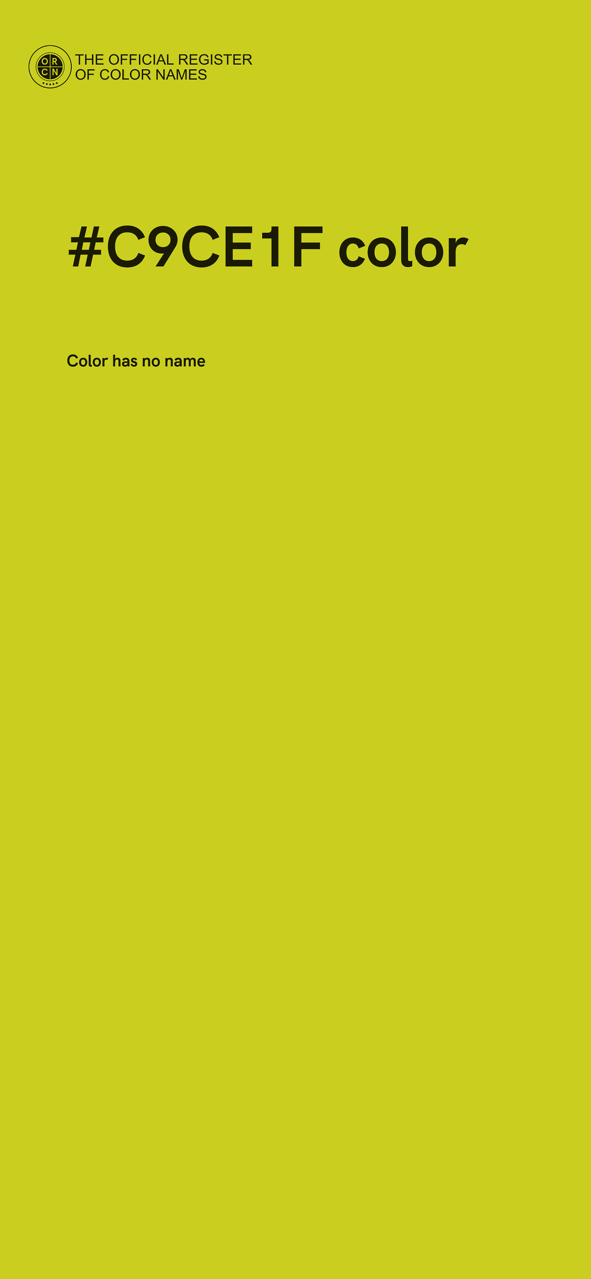 The digital color HEX #C9CE1F belongs to the Yellow Color Family featuring High Saturation (Saturation Family) and Light (Brightness Family).
