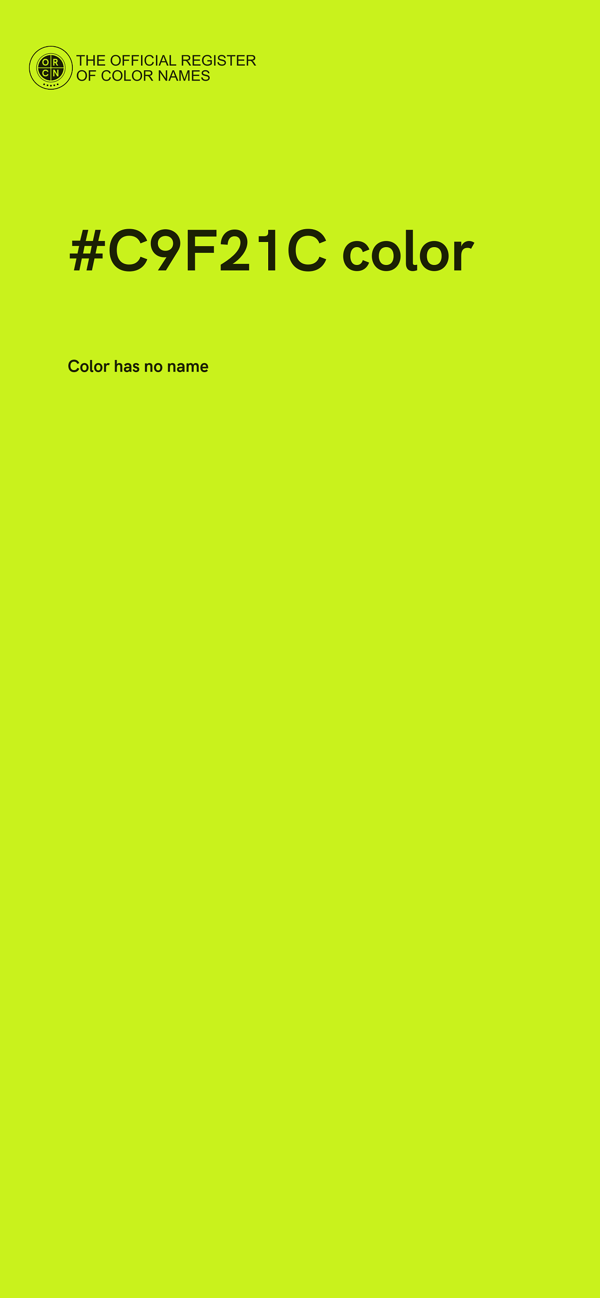 The digital color HEX #C9F21C belongs to the Yellow Color Family featuring Full Saturation (Saturation Family) and Light (Brightness Family).