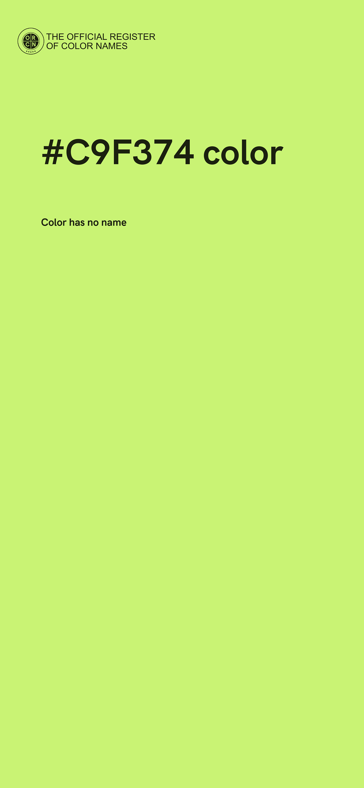 The digital color HEX #C9F374 belongs to the Chartreuse Color Family featuring High Saturation (Saturation Family) and Very Light (Brightness Family).