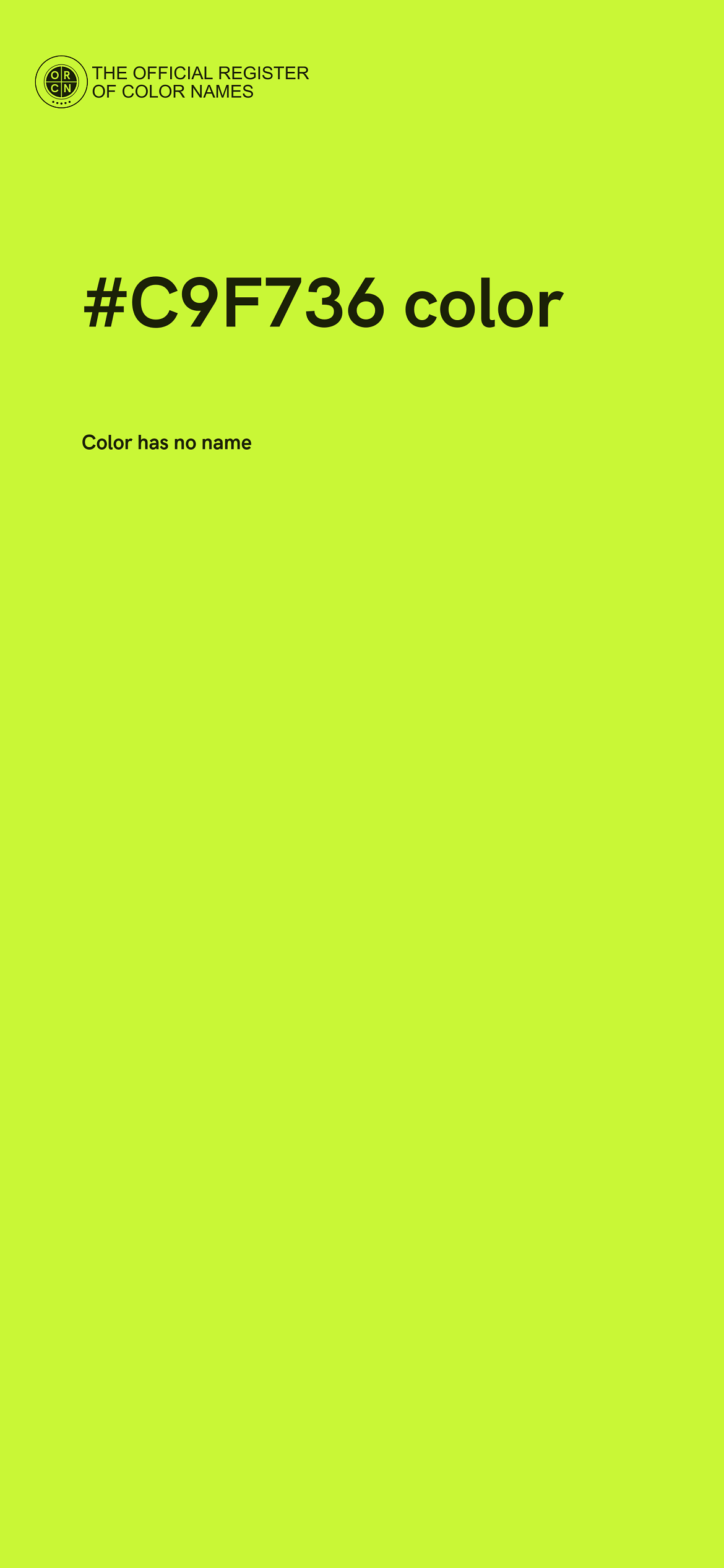 The digital color HEX #C9F736 belongs to the Yellow Color Family featuring Full Saturation (Saturation Family) and Light (Brightness Family).