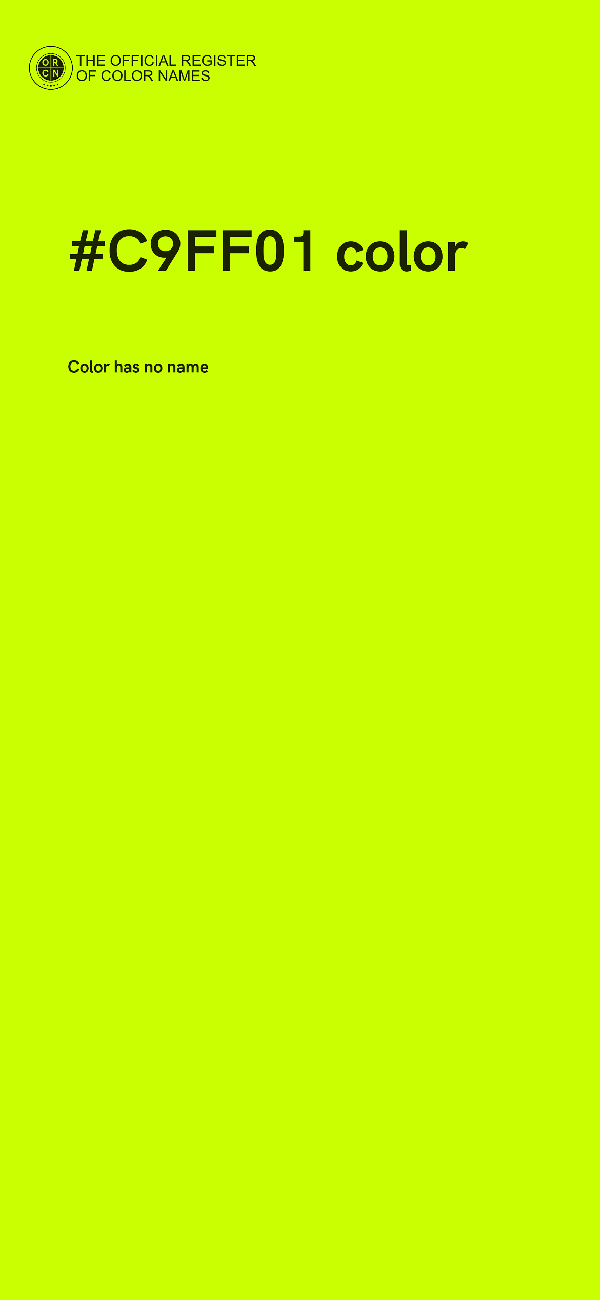 The digital color HEX #C9FF01 belongs to the Yellow Color Family featuring Full Saturation (Saturation Family) and Light (Brightness Family).