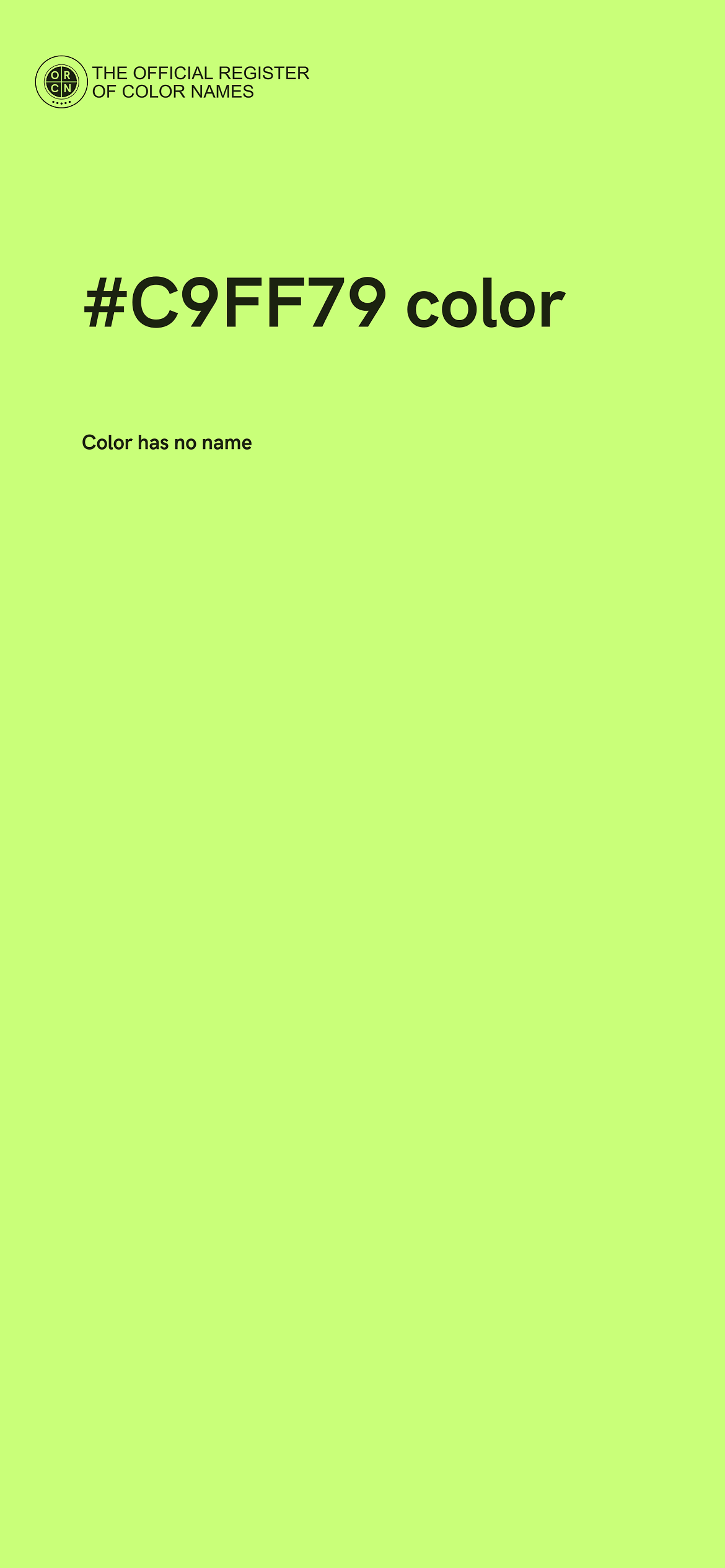 The digital color HEX #C9FF79 belongs to the Chartreuse Color Family featuring Full Saturation (Saturation Family) and Very Light (Brightness Family).
