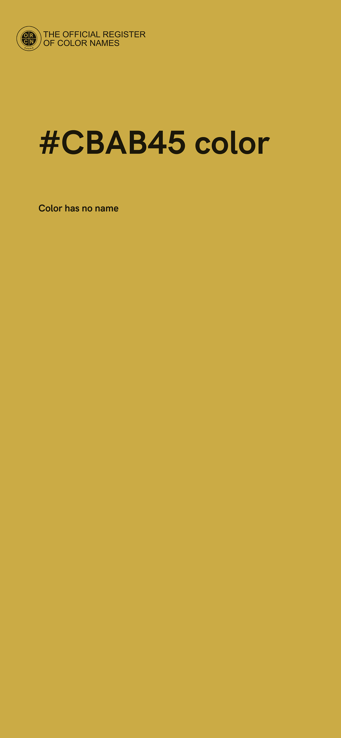 The digital color HEX #CBAB45 belongs to the Yellow Color Family featuring Moderate Saturation (Saturation Family) and Light (Brightness Family).