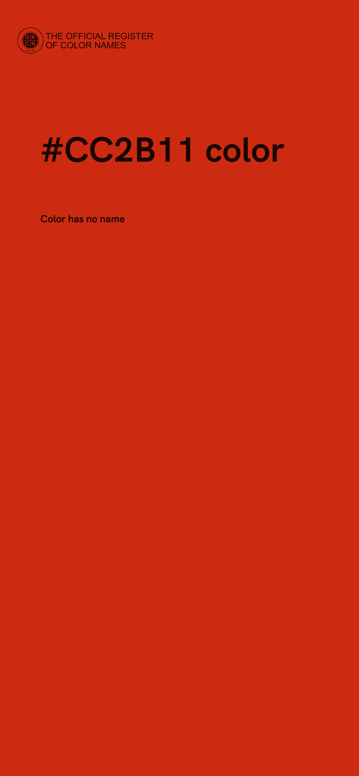 The digital color HEX #CC2B11 belongs to the Red Color Family featuring Full Saturation (Saturation Family) and Light (Brightness Family).