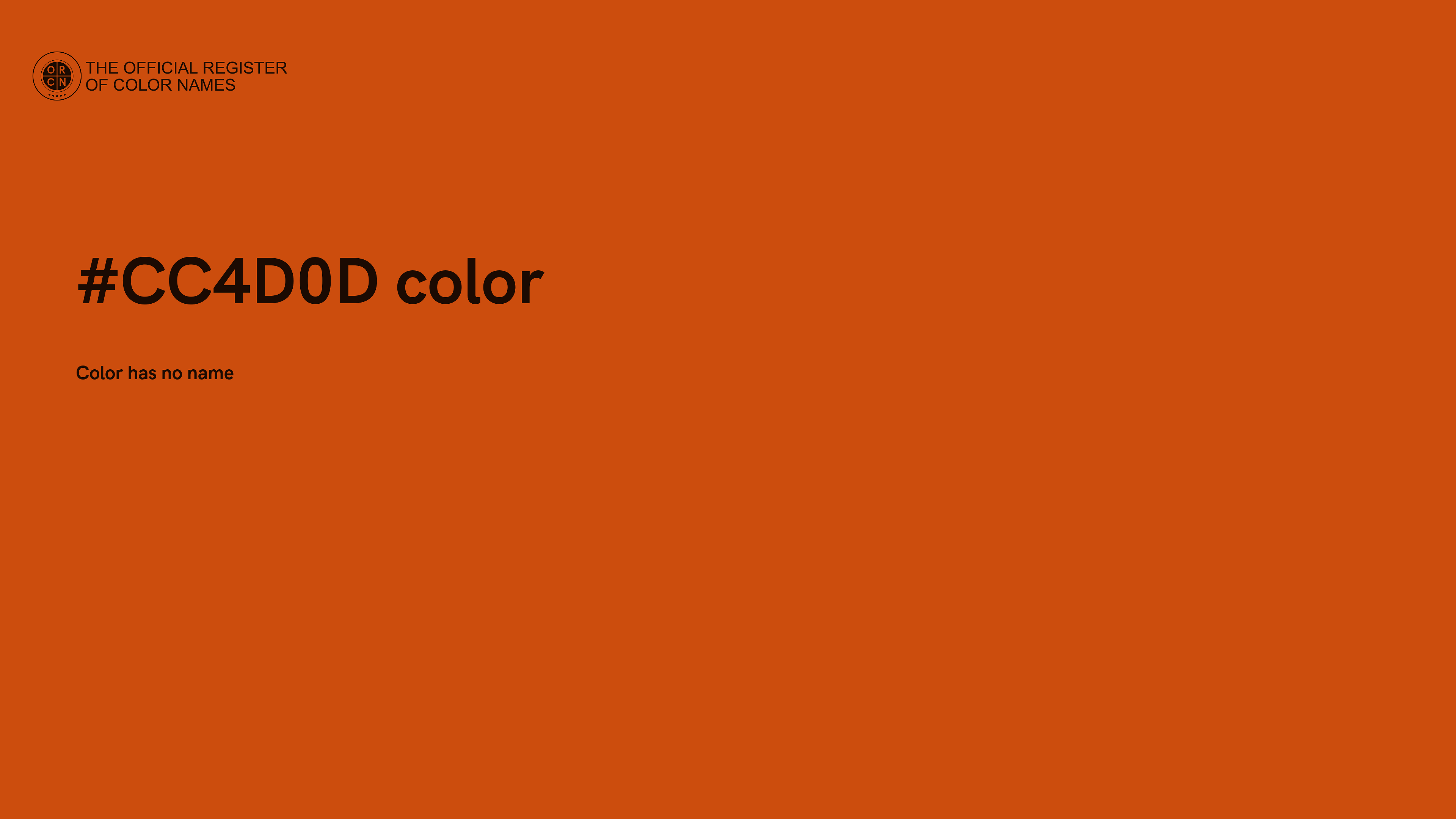 The digital color HEX #CC4D0D belongs to the Orange Color Family featuring Full Saturation (Saturation Family) and Light (Brightness Family).