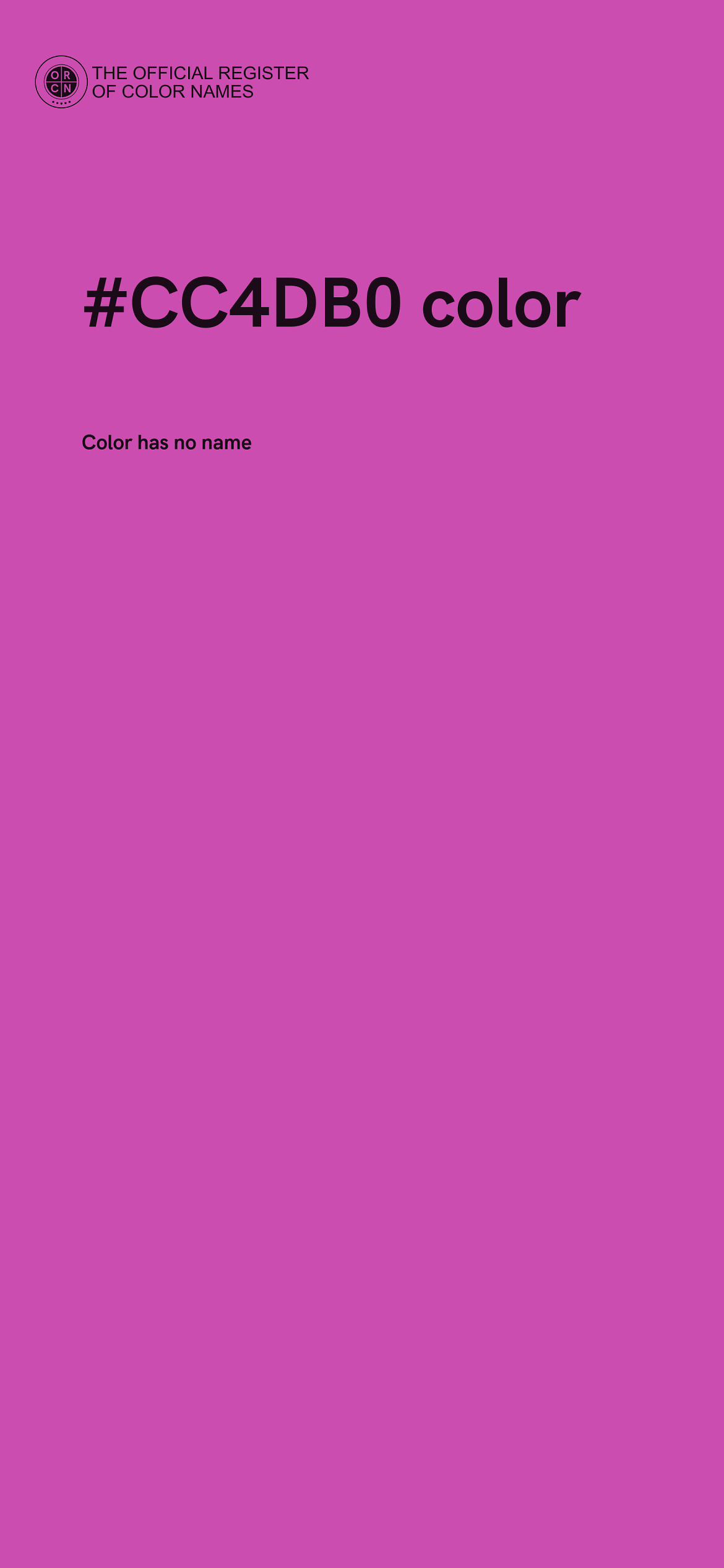 For printing in non digital world, #CC4DB0 is represented in CMYK as 0 Cyan, 50 Magenta, 11 Yellow, and 20 Black (Key) (C:0 M:50 Y:11 K:20).