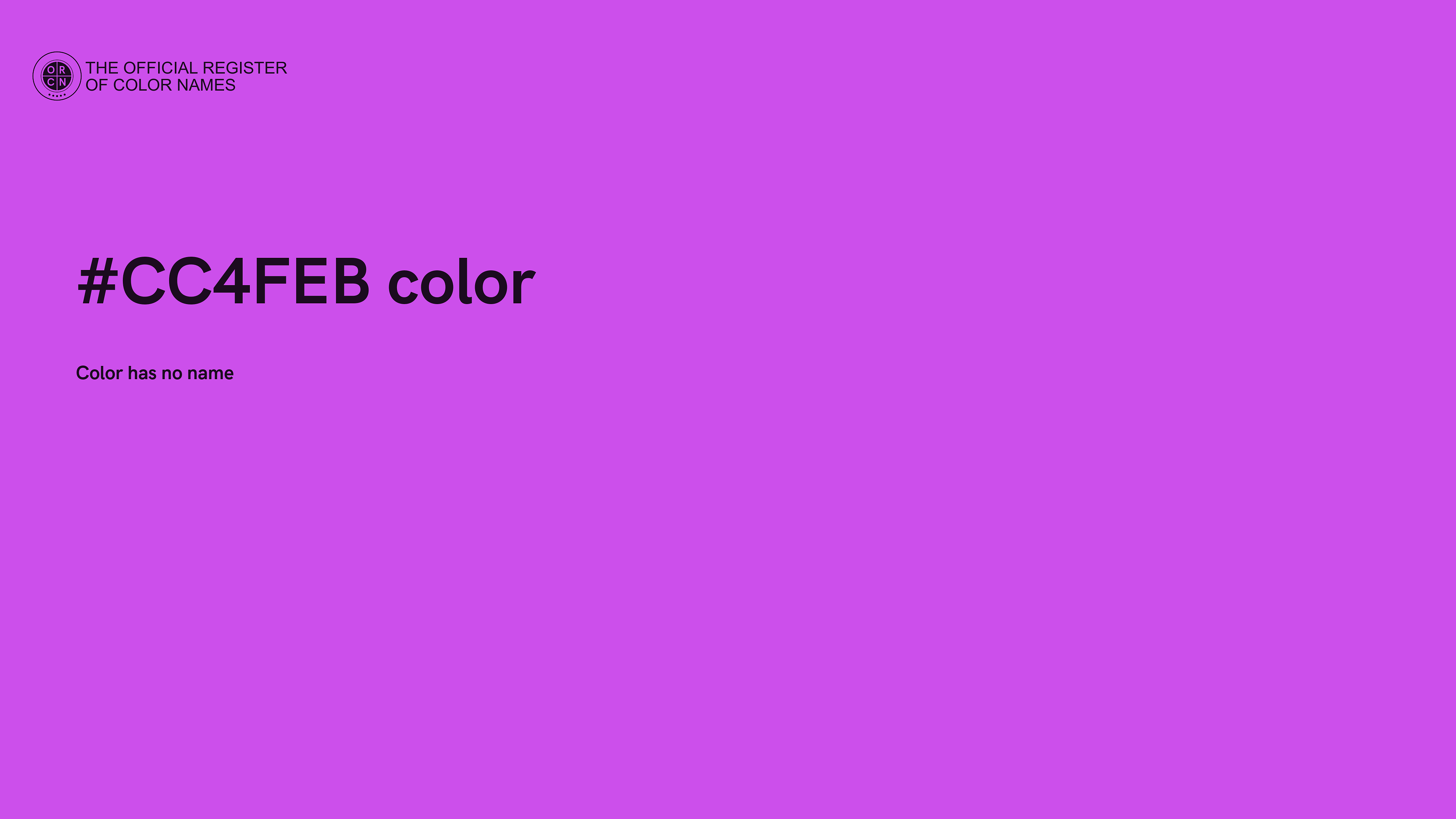 HEX code #CC4FEB represent the color in hexadecimal format by combining three values – the amounts of Red, Green and Blue (RGB). Its RGB composition is 204, 79, 235 ( rgb(204, 79, 235) ), which breaks down into 80% of Red, 31% Green and 92.2% Blue.