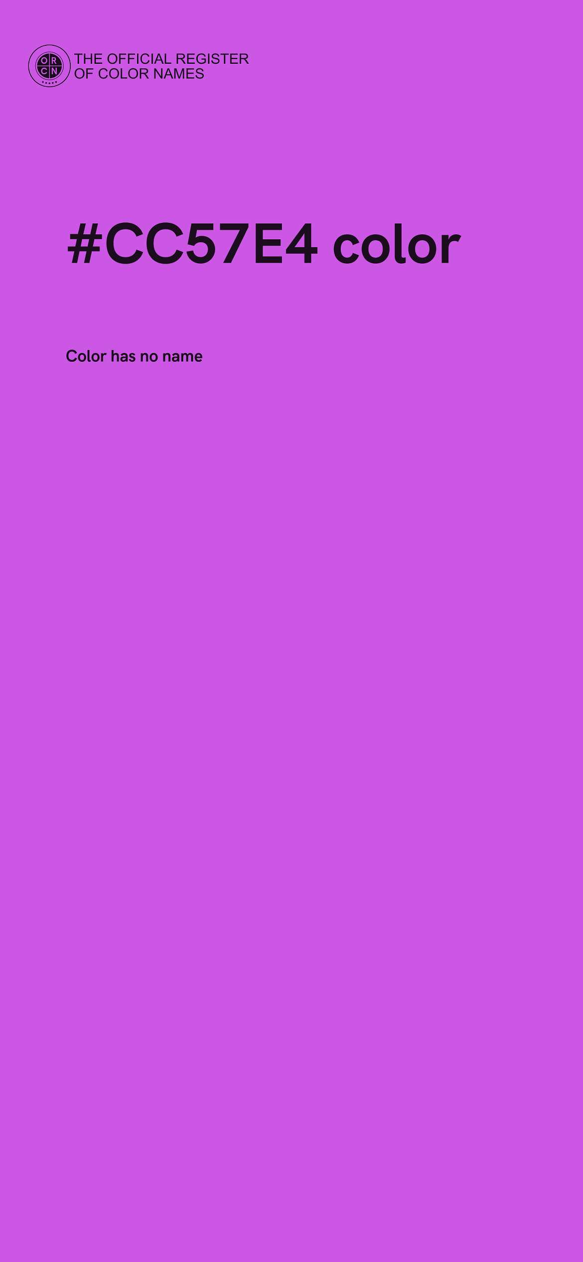 The digital color HEX #CC57E4 belongs to the Magenta Color Family featuring High Saturation (Saturation Family) and Very Light (Brightness Family).