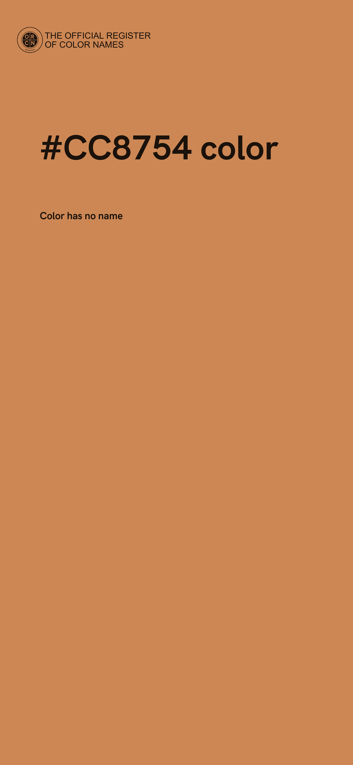 The digital color HEX #CC8754 belongs to the Orange Color Family featuring Moderate Saturation (Saturation Family) and Light (Brightness Family).