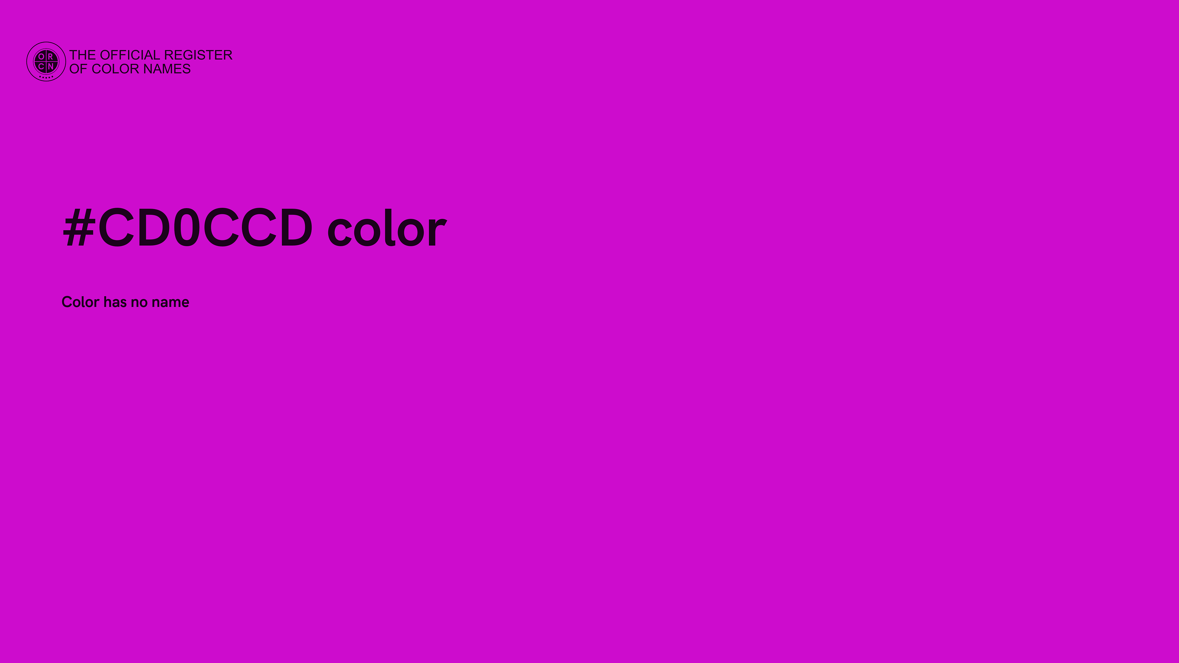 HEX code #CD0CCD represent the color in hexadecimal format by combining three values – the amounts of Red, Green and Blue (RGB). Its RGB composition is 205, 12, 205 ( rgb(205, 12, 205) ), which breaks down into 80.4% of Red, 4.7% Green and 80.4% Blue.