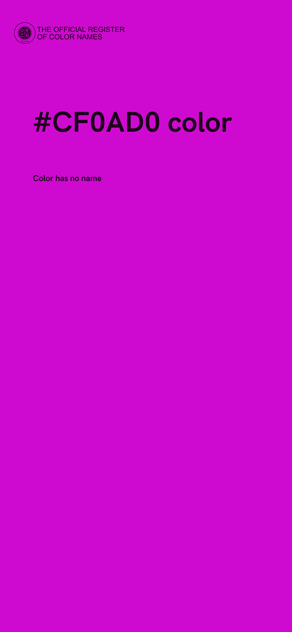 The digital color HEX #CF0AD0 belongs to the Magenta Color Family featuring Full Saturation (Saturation Family) and Light (Brightness Family).
