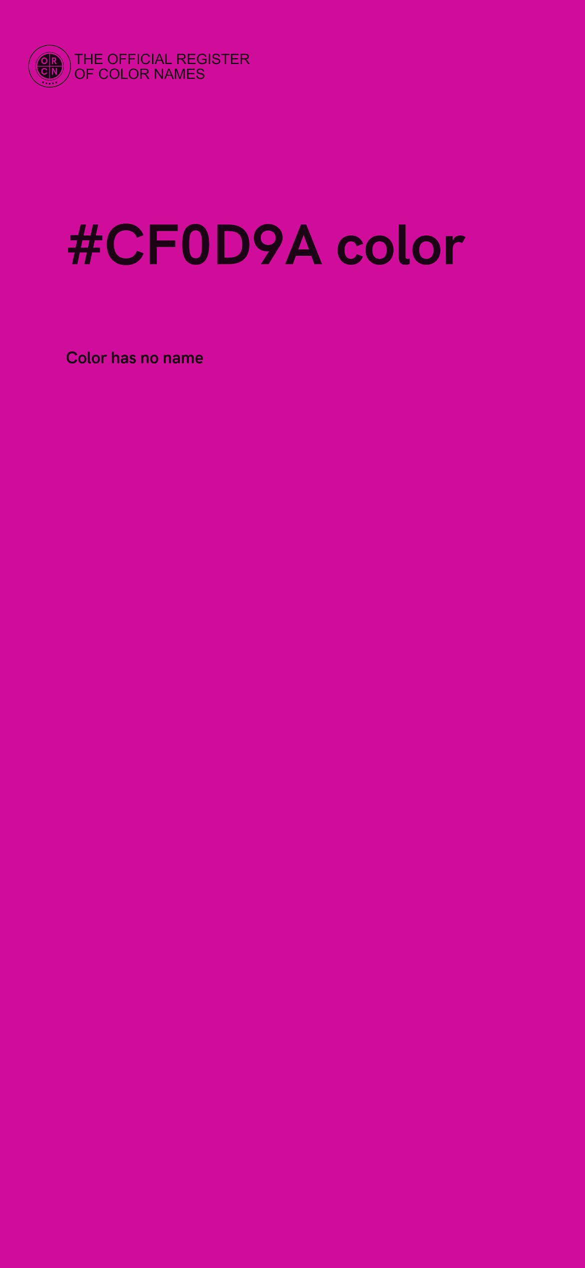 For printing in non digital world, #CF0D9A is represented in CMYK as 0 Cyan, 76 Magenta, 21 Yellow, and 19 Black (Key) (C:0 M:76 Y:21 K:19).