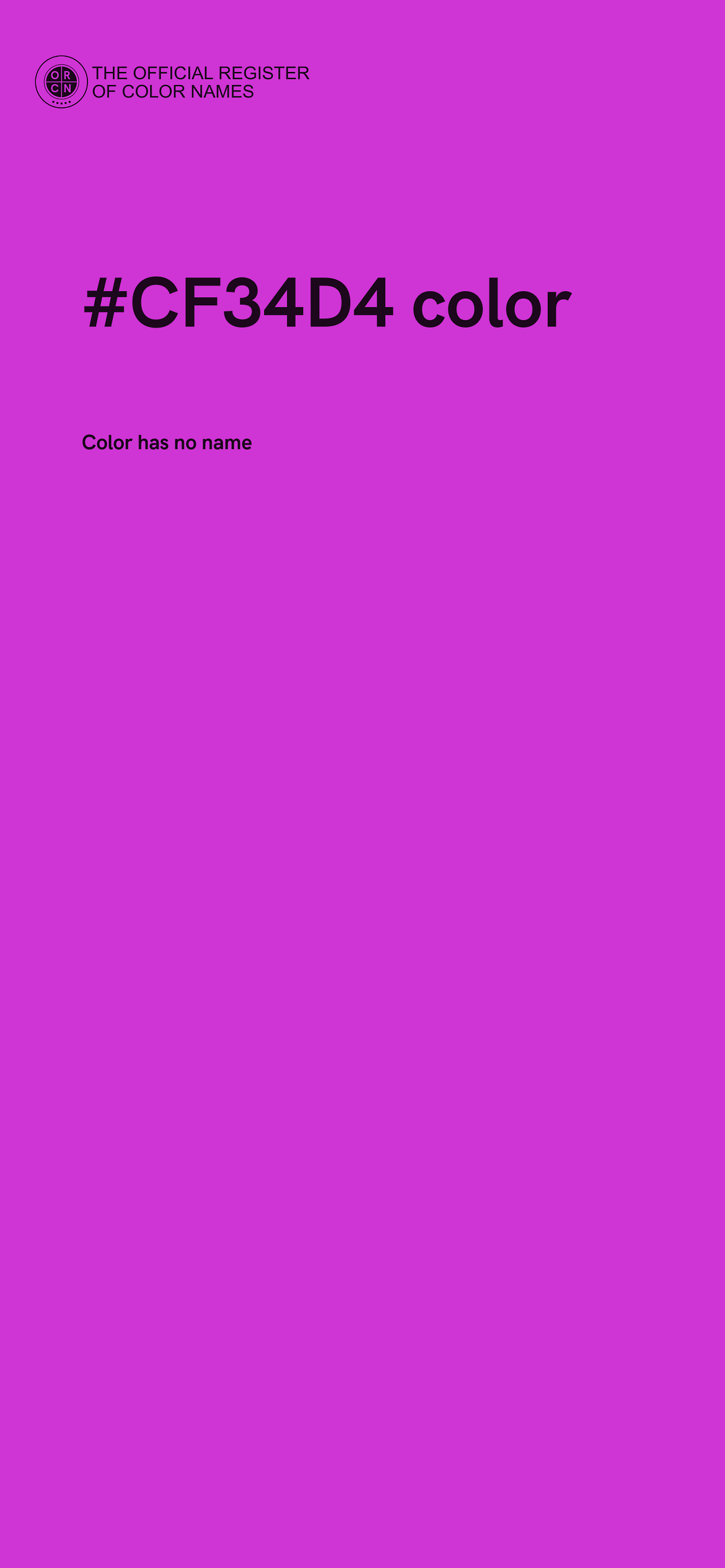 The digital color HEX #CF34D4 belongs to the Magenta Color Family featuring High Saturation (Saturation Family) and Light (Brightness Family).
