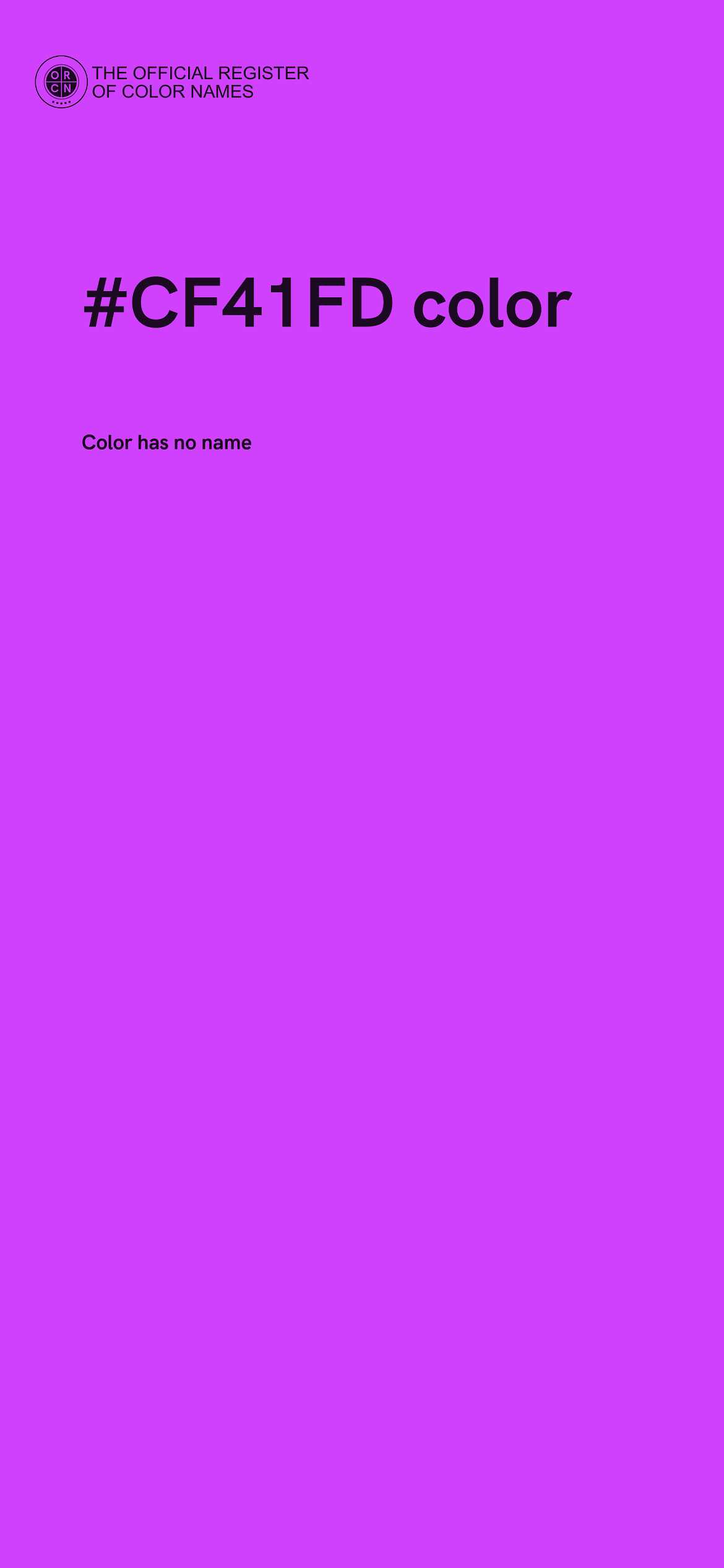 For printing in non digital world, #CF41FD is represented in CMYK as 18 Cyan, 74 Magenta, 0 Yellow, and 1 Black (Key) (C:18 M:74 Y:0 K:1).