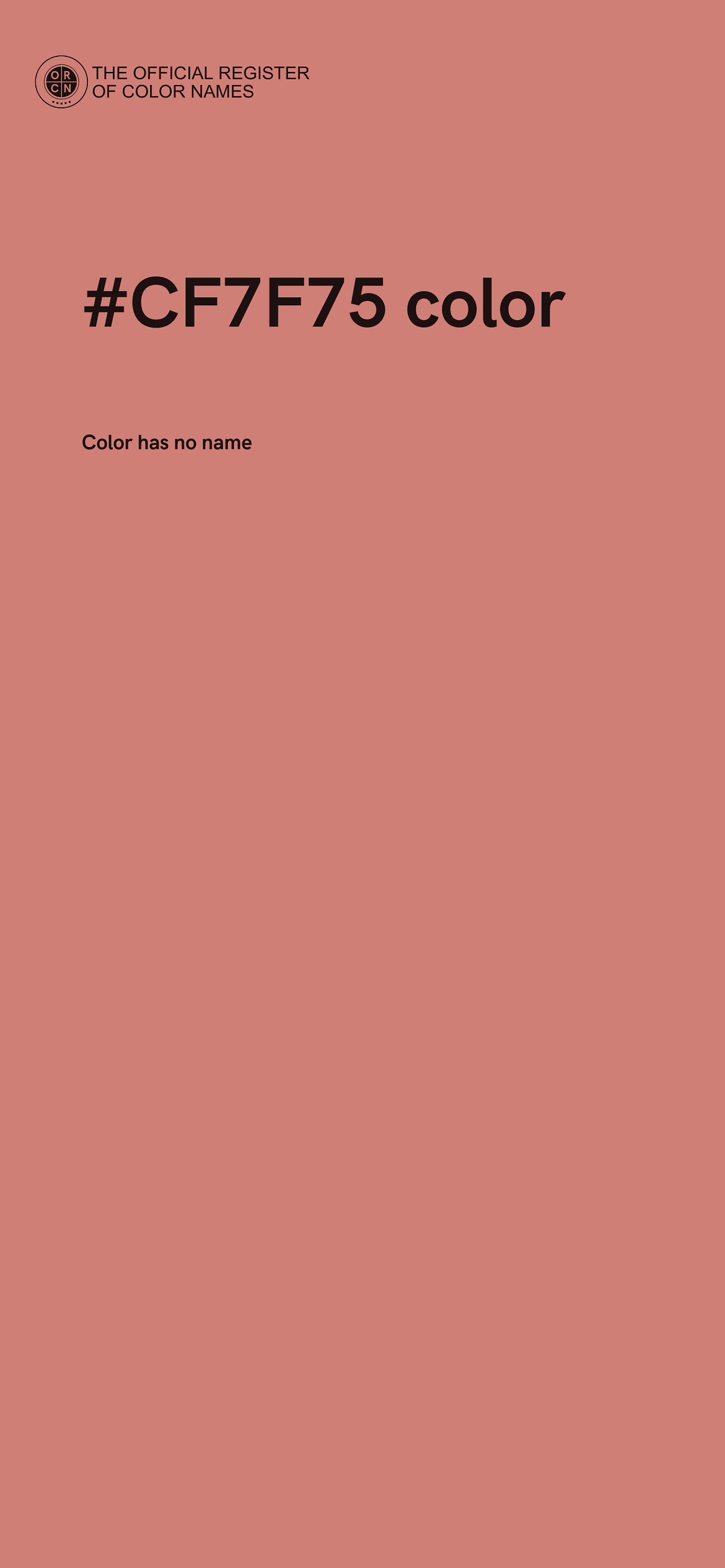 The digital color HEX #CF7F75 belongs to the Red Color Family featuring Moderate Saturation (Saturation Family) and Very Light (Brightness Family).