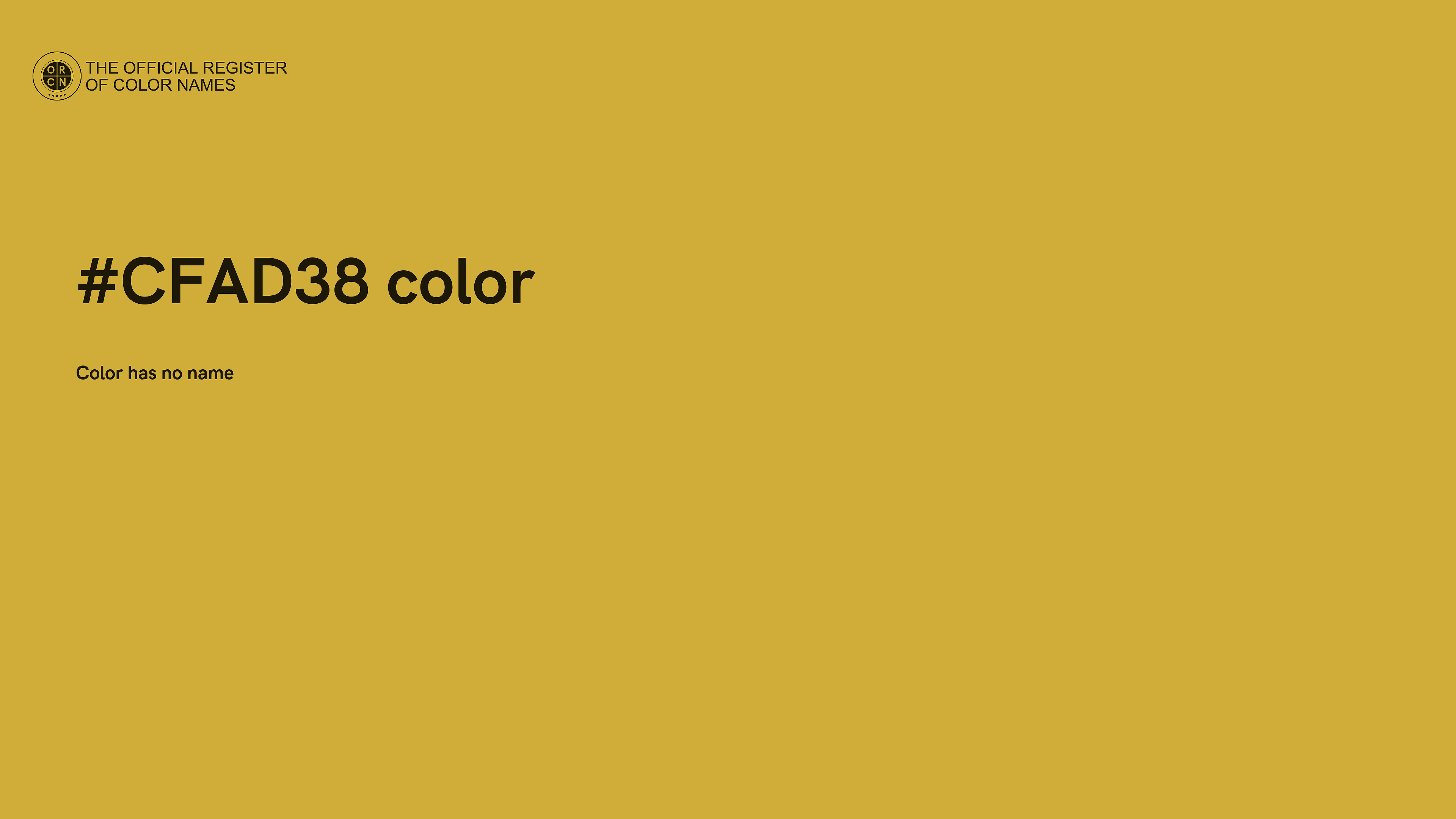 The digital color HEX #CFAD38 belongs to the Yellow Color Family featuring High Saturation (Saturation Family) and Light (Brightness Family).