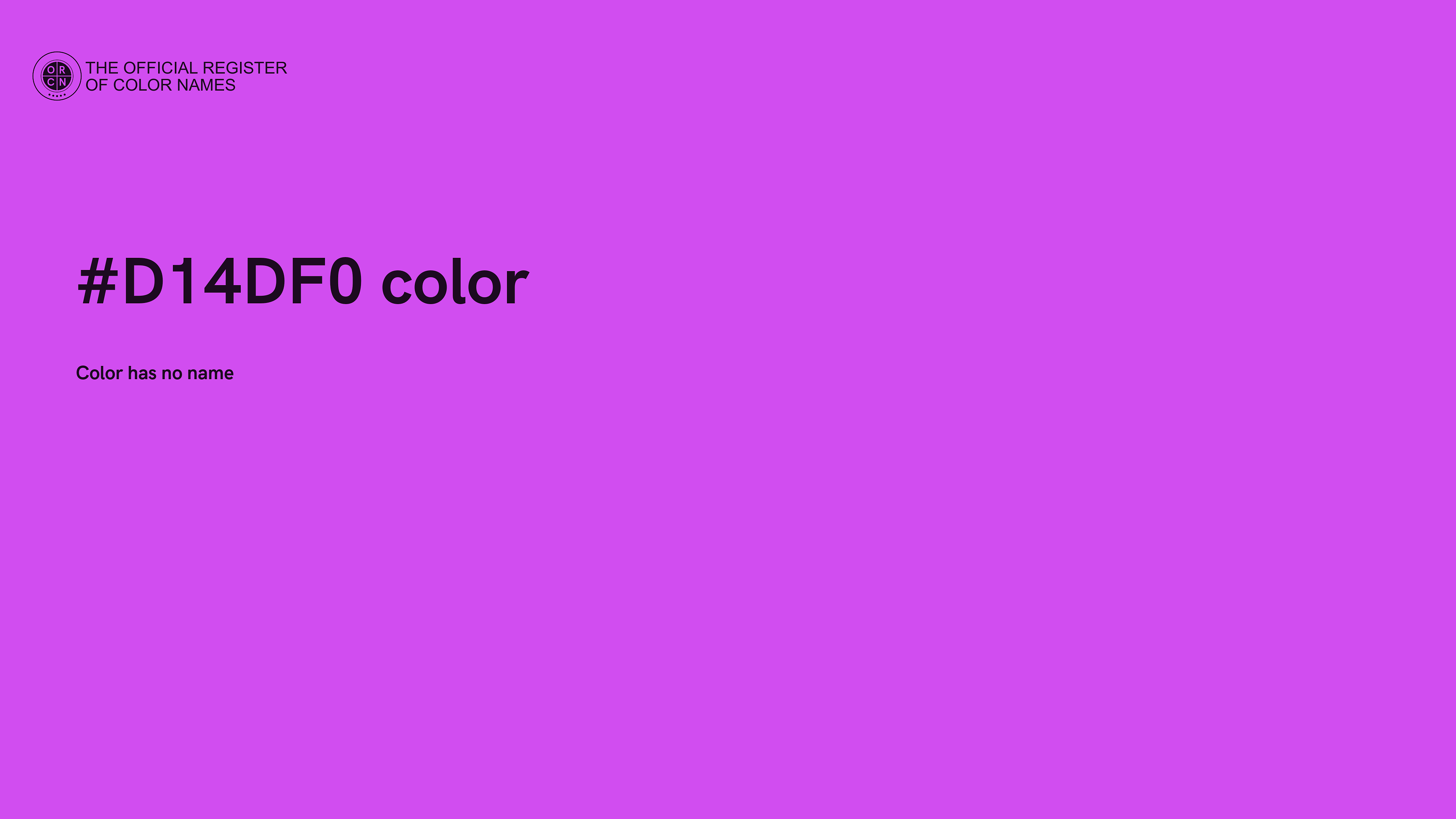 HEX code #D14DF0 represent the color in hexadecimal format by combining three values – the amounts of Red, Green and Blue (RGB). Its RGB composition is 209, 77, 240 ( rgb(209, 77, 240) ), which breaks down into 82% of Red, 30.2% Green and 94.1% Blue.