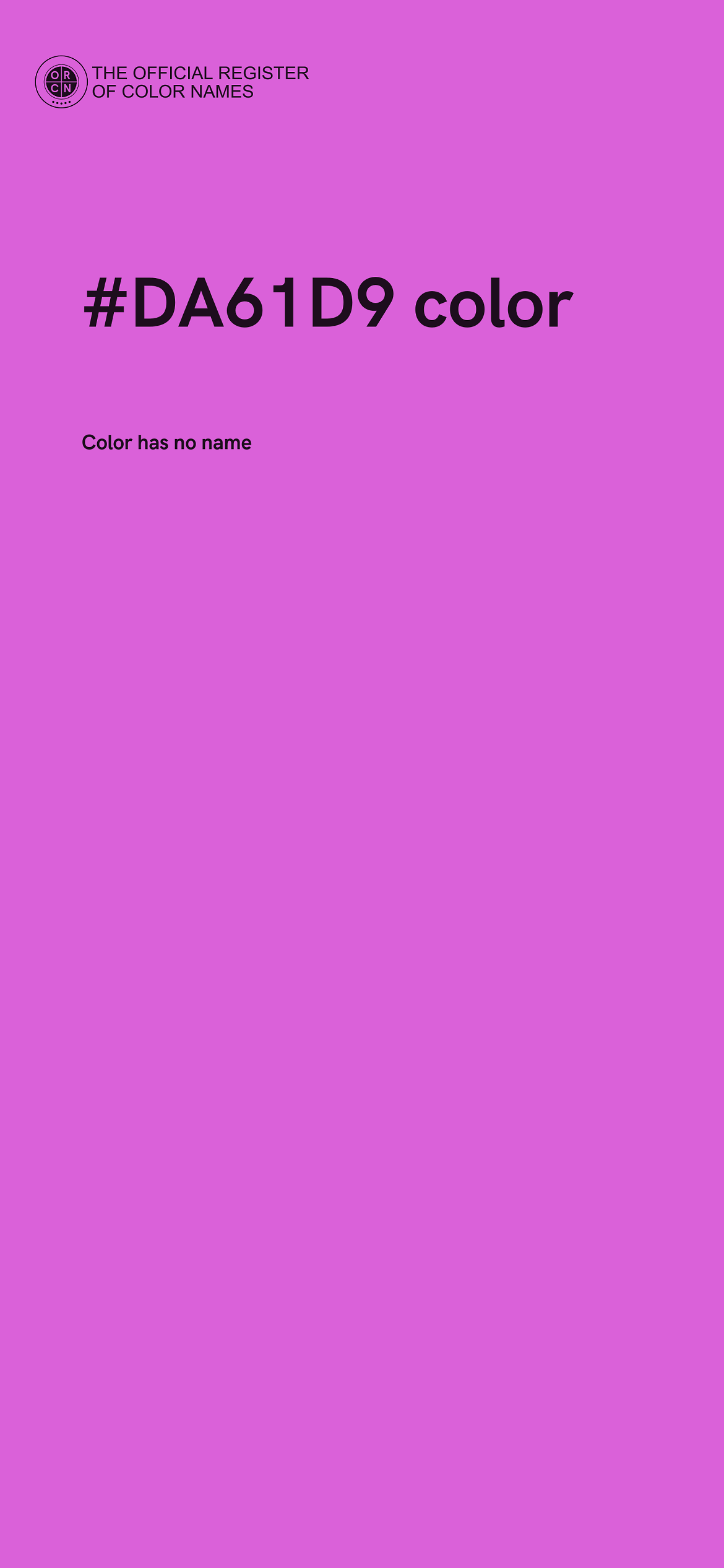 The digital color HEX #DA61D9 belongs to the Magenta Color Family featuring High Saturation (Saturation Family) and Very Light (Brightness Family).