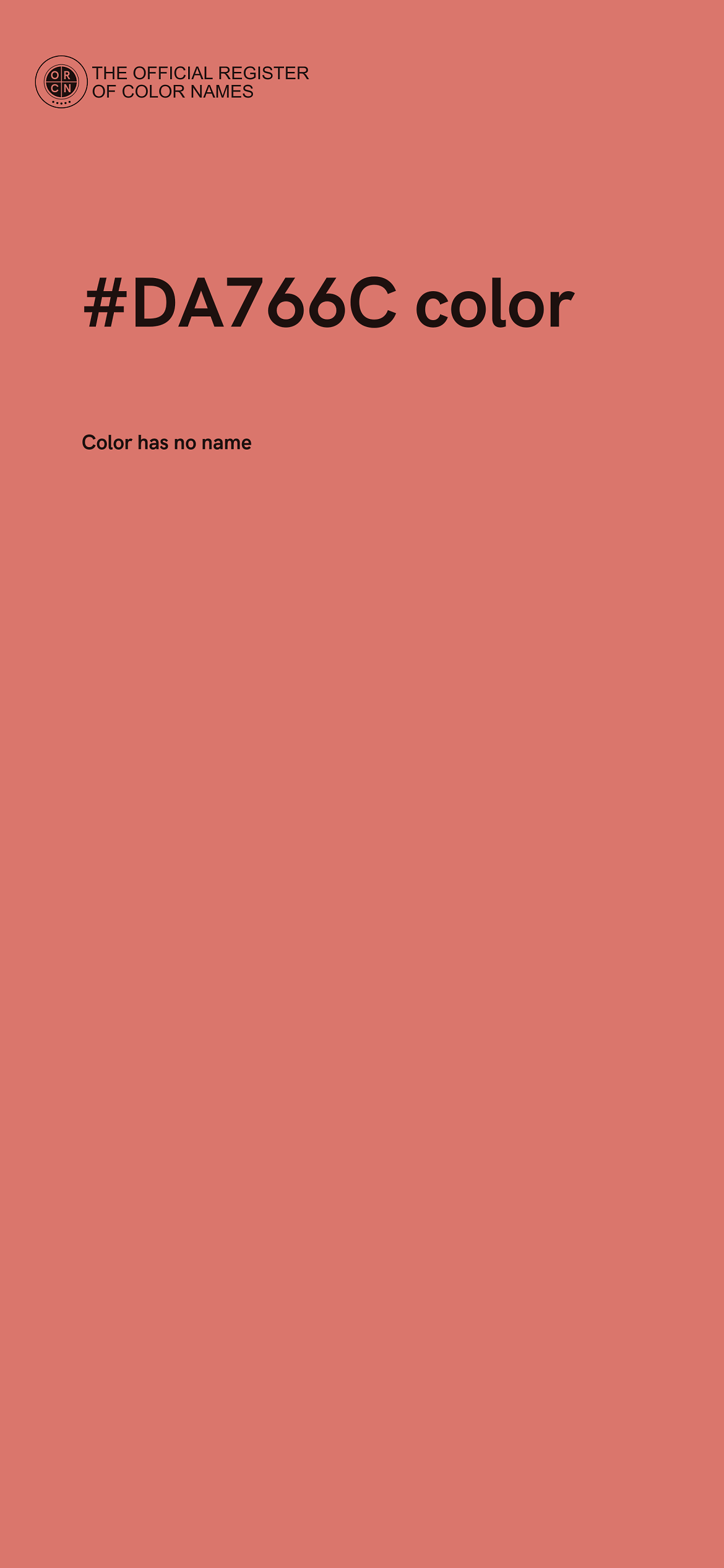 For printing in non digital world, #DA766C is represented in CMYK as 0 Cyan, 39 Magenta, 43 Yellow, and 15 Black (Key) (C:0 M:39 Y:43 K:15).