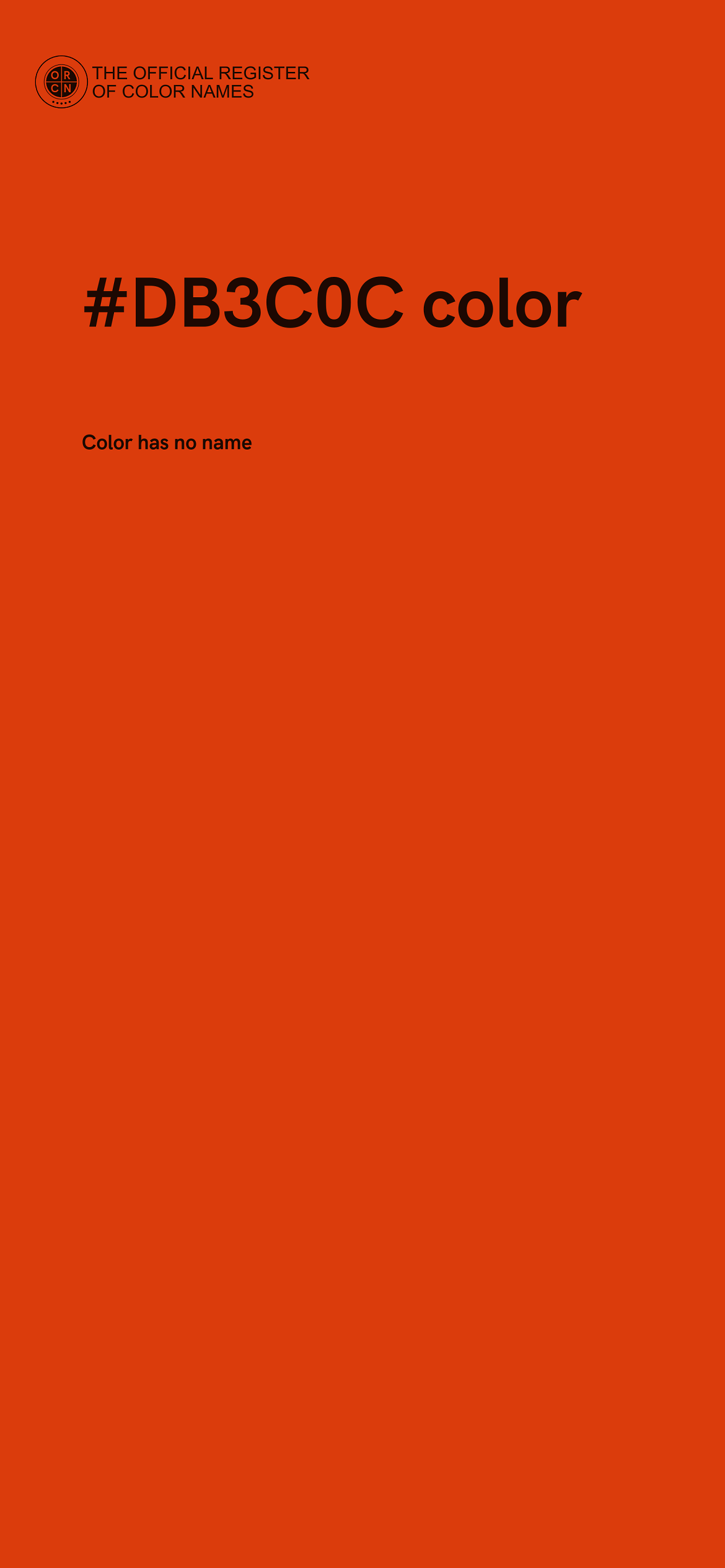 The digital color HEX #DB3C0C belongs to the Red Color Family featuring Full Saturation (Saturation Family) and Light (Brightness Family).