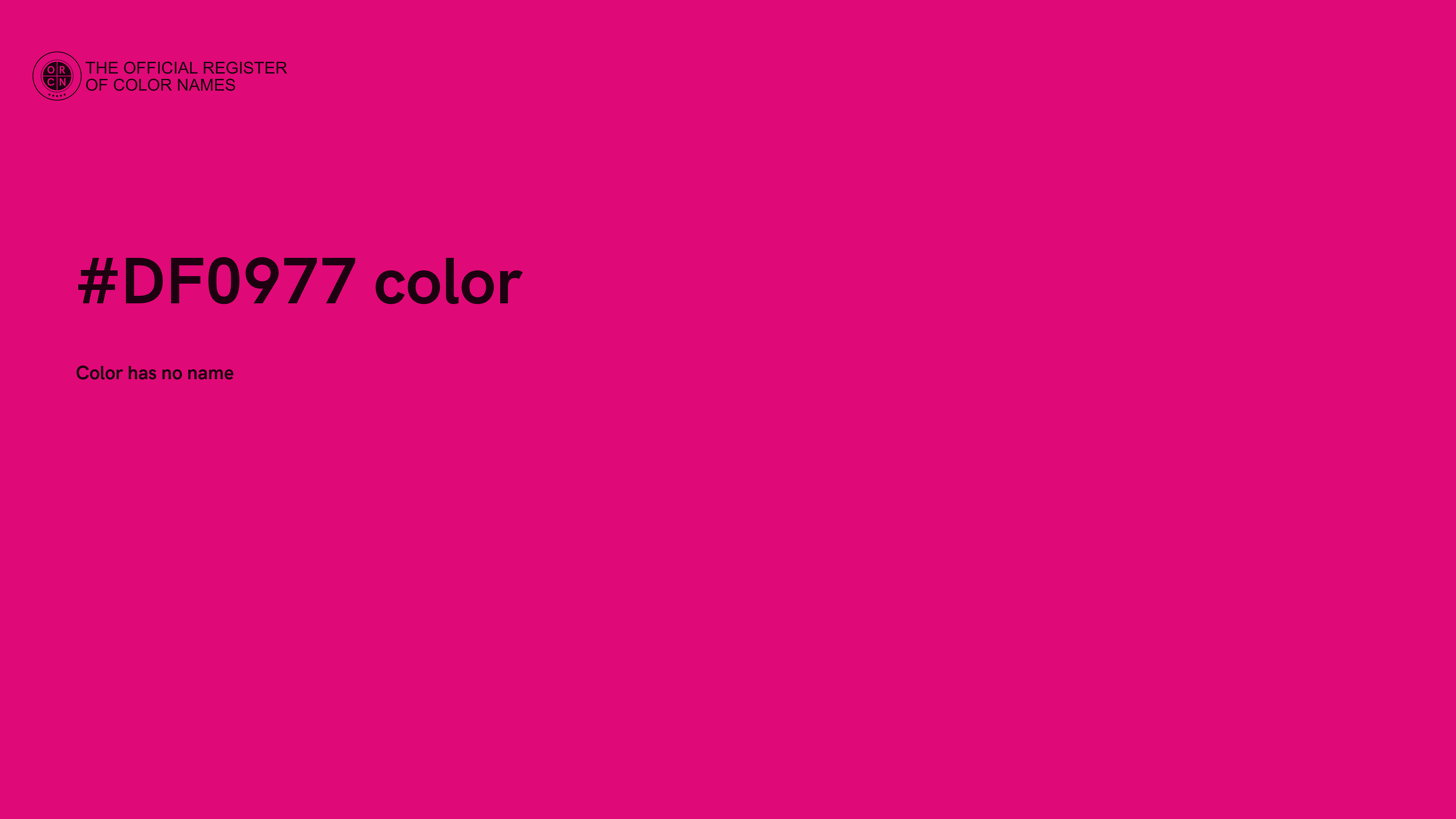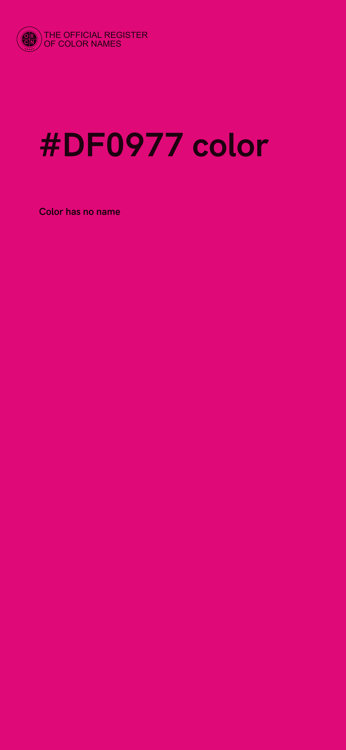 For printing in non digital world, #DF0977 is represented in CMYK as 0 Cyan, 84 Magenta, 41 Yellow, and 13 Black (Key) (C:0 M:84 Y:41 K:13).