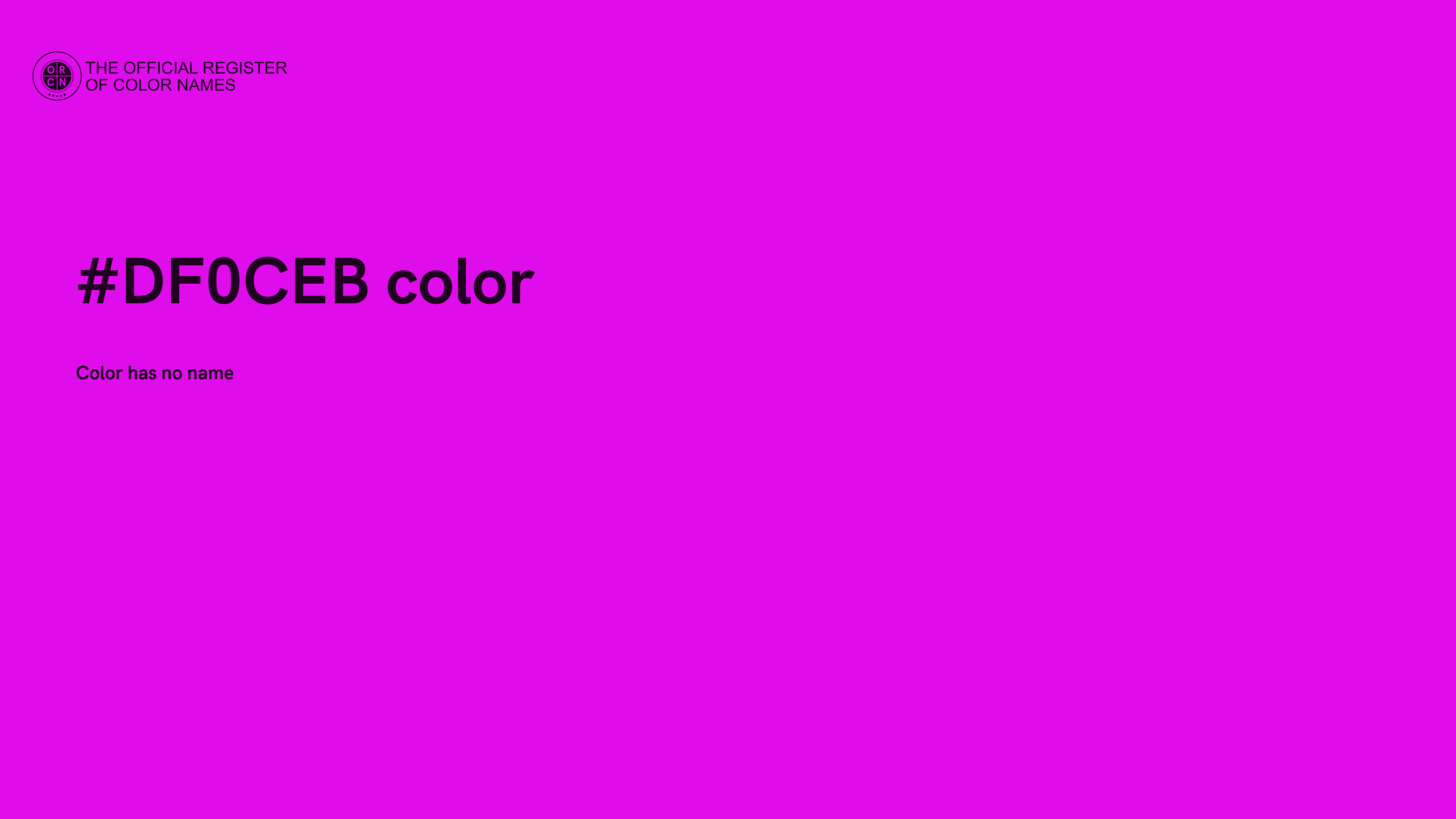HEX code #DF0CEB represent the color in hexadecimal format by combining three values – the amounts of Red, Green and Blue (RGB). Its RGB composition is 223, 12, 235 ( rgb(223, 12, 235) ), which breaks down into 87.5% of Red, 4.7% Green and 92.2% Blue.