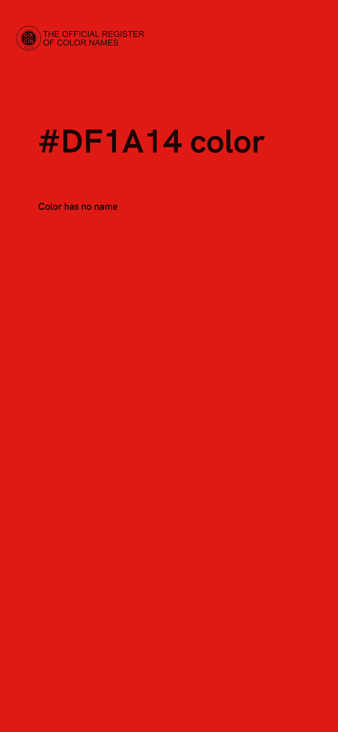 The digital color HEX #DF1A14 belongs to the Red Color Family featuring High Saturation (Saturation Family) and Light (Brightness Family).