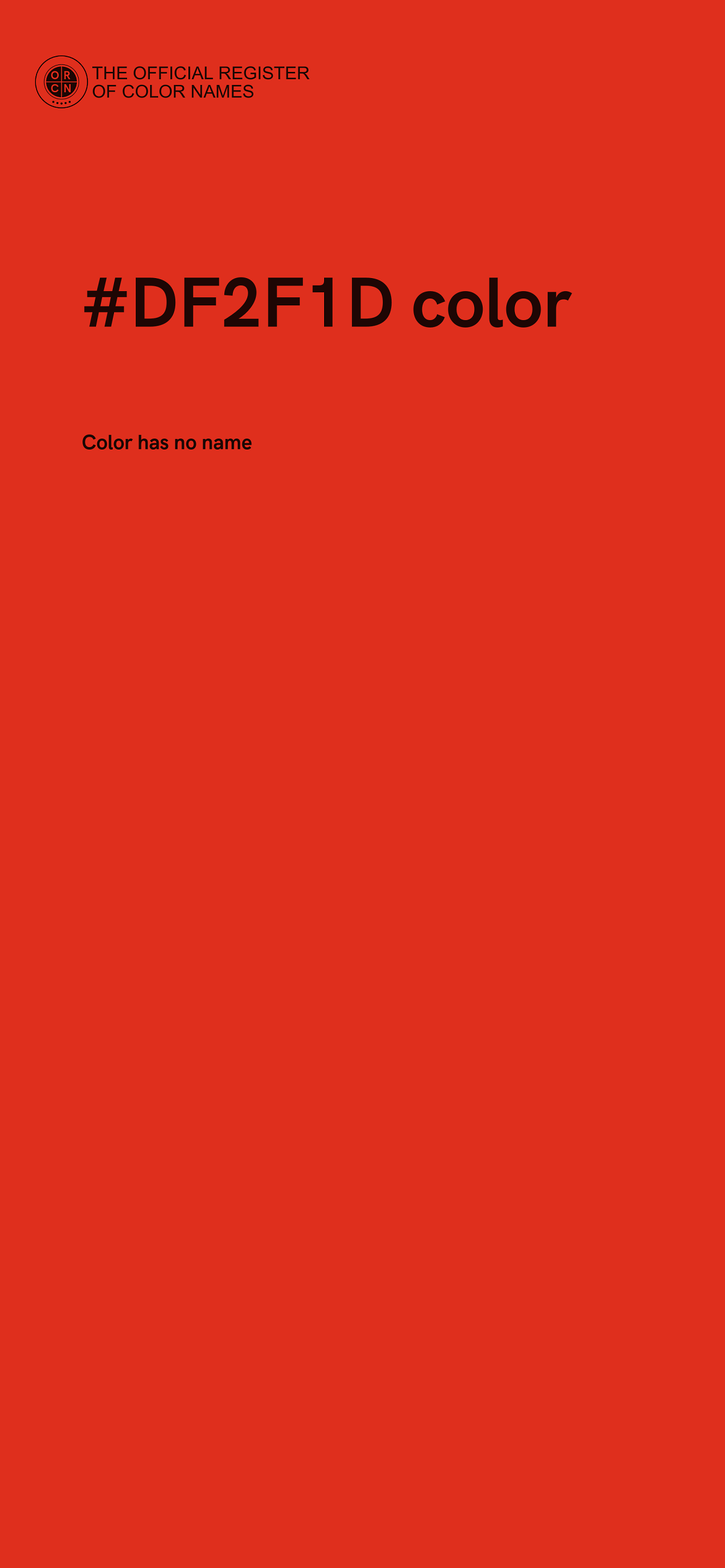 The digital color HEX #DF2F1D belongs to the Red Color Family featuring High Saturation (Saturation Family) and Light (Brightness Family).