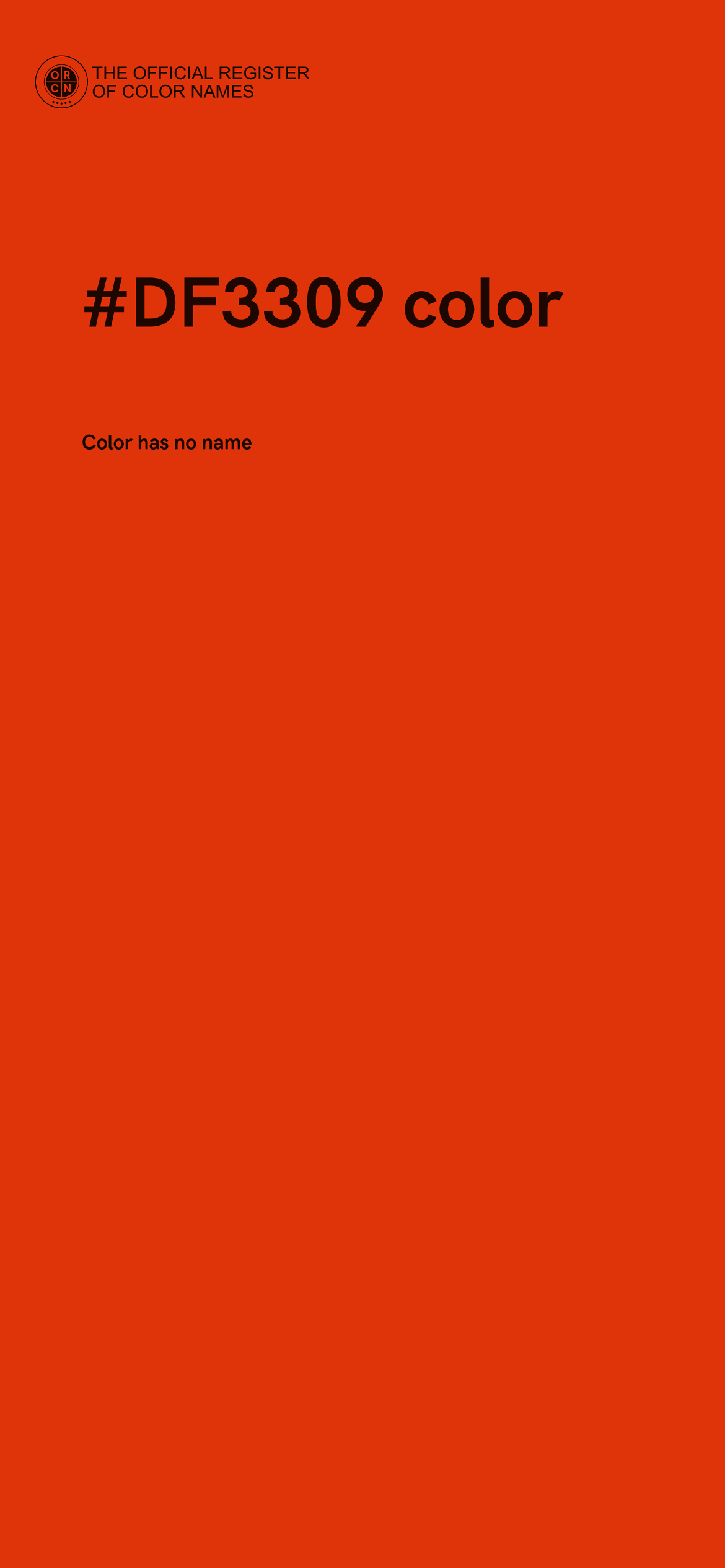 The digital color HEX #DF3309 belongs to the Red Color Family featuring Full Saturation (Saturation Family) and Light (Brightness Family).