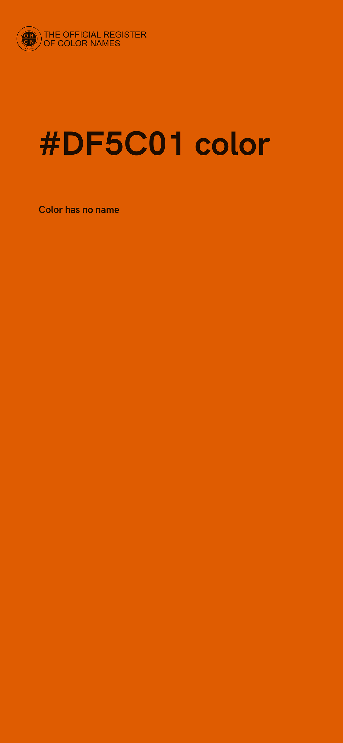 The digital color HEX #DF5C01 belongs to the Orange Color Family featuring Full Saturation (Saturation Family) and Light (Brightness Family).