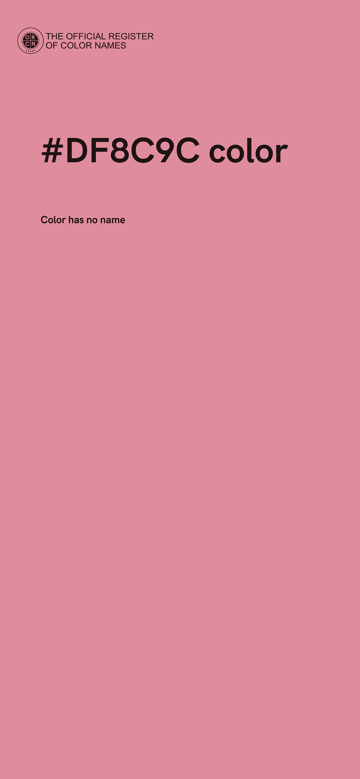 The digital color HEX #DF8C9C belongs to the Red Color Family featuring Moderate Saturation (Saturation Family) and Very Light (Brightness Family).