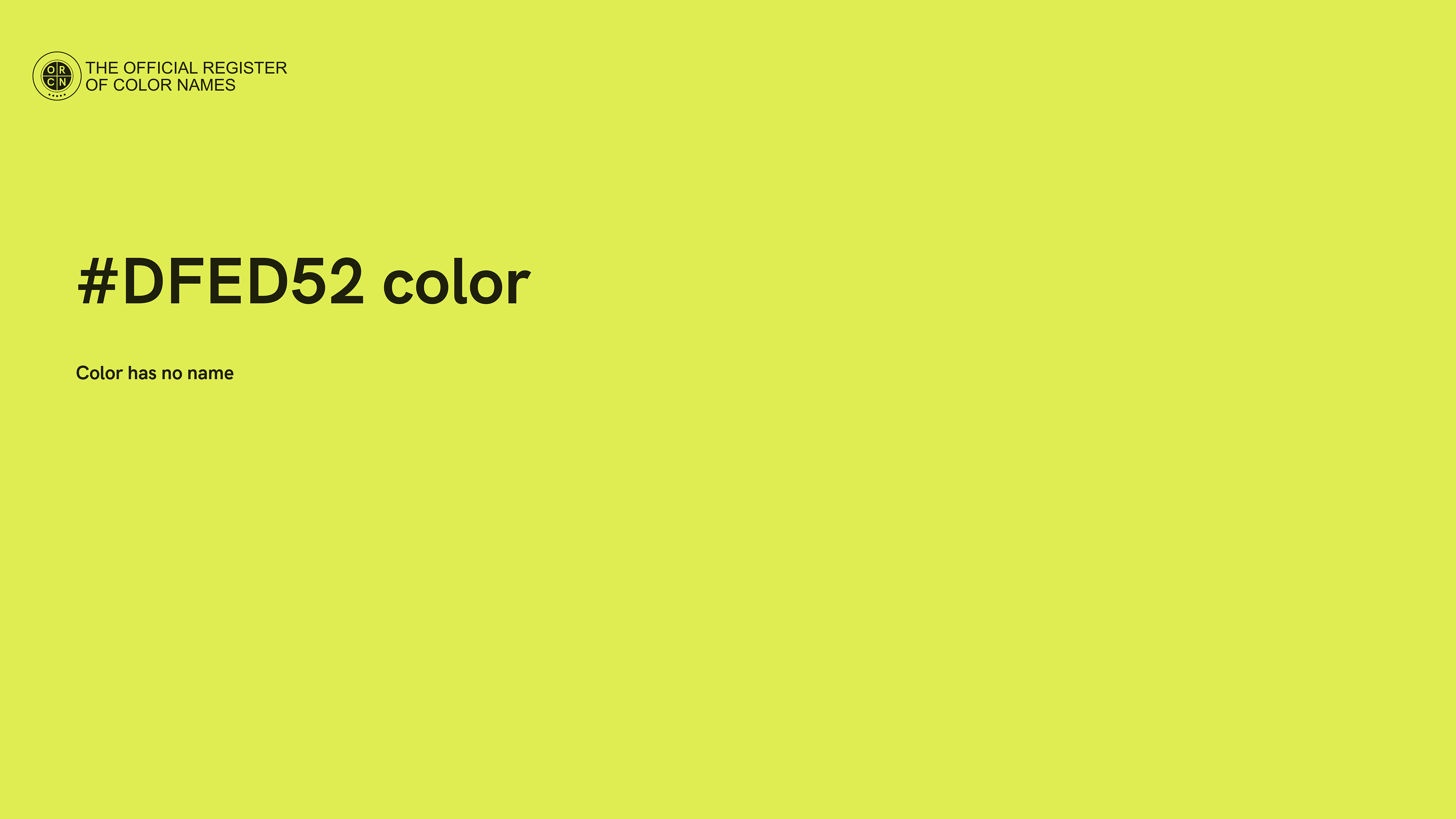 The digital color HEX #DFED52 belongs to the Yellow Color Family featuring High Saturation (Saturation Family) and Very Light (Brightness Family).