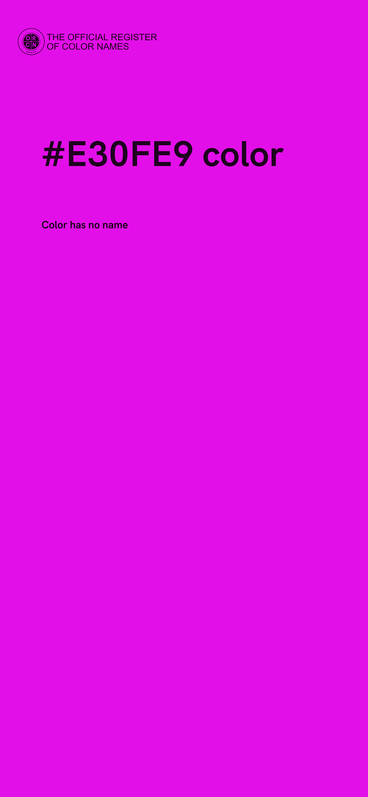 For printing in non digital world, #E30FE9 is represented in CMYK as 2 Cyan, 85 Magenta, 0 Yellow, and 9 Black (Key) (C:2 M:85 Y:0 K:9).
