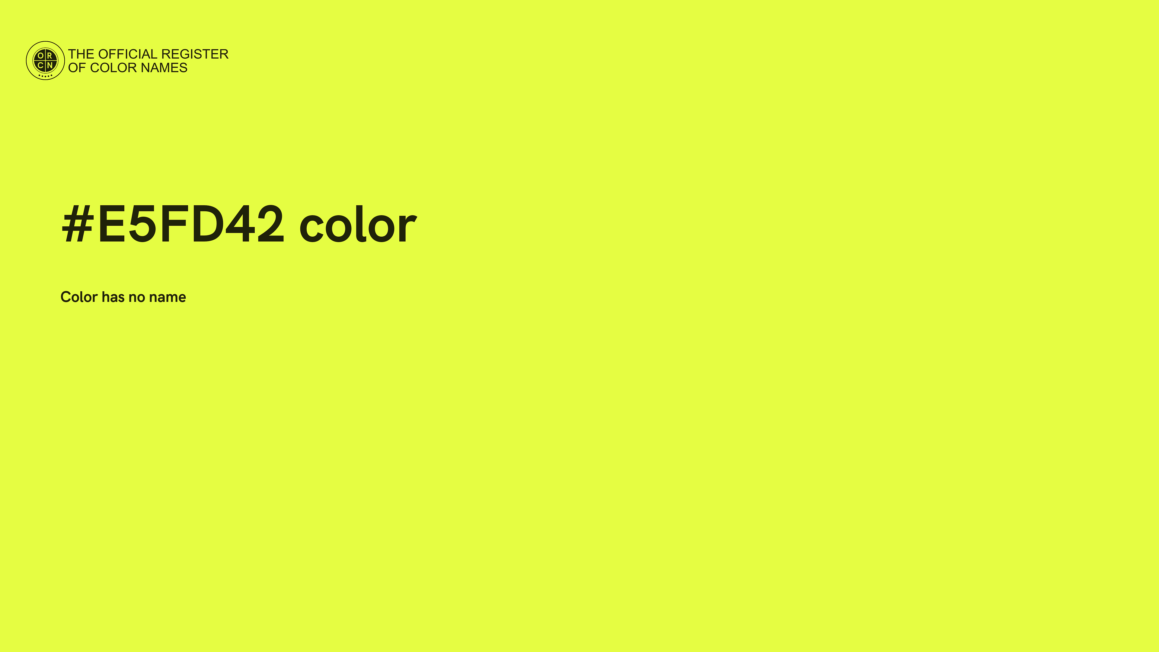 The digital color HEX #E5FD42 belongs to the Yellow Color Family featuring Full Saturation (Saturation Family) and Very Light (Brightness Family).