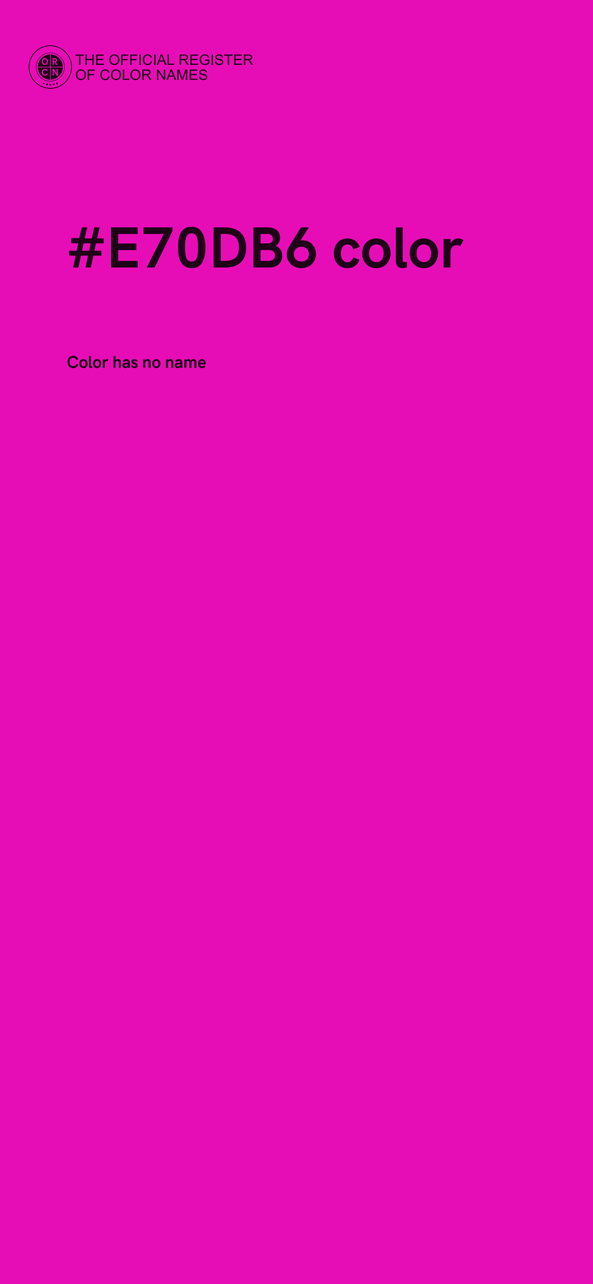 For printing in non digital world, #E70DB6 is represented in CMYK as 0 Cyan, 85 Magenta, 19 Yellow, and 9 Black (Key) (C:0 M:85 Y:19 K:9).