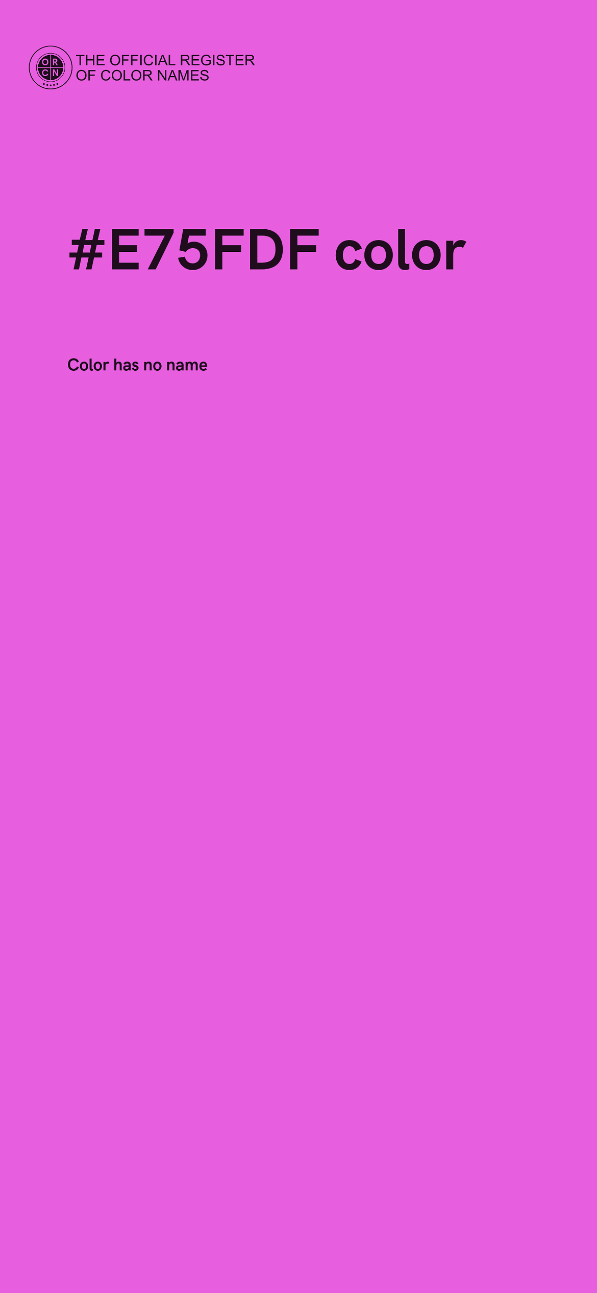 The digital color HEX #E75FDF belongs to the Magenta Color Family featuring High Saturation (Saturation Family) and Very Light (Brightness Family).