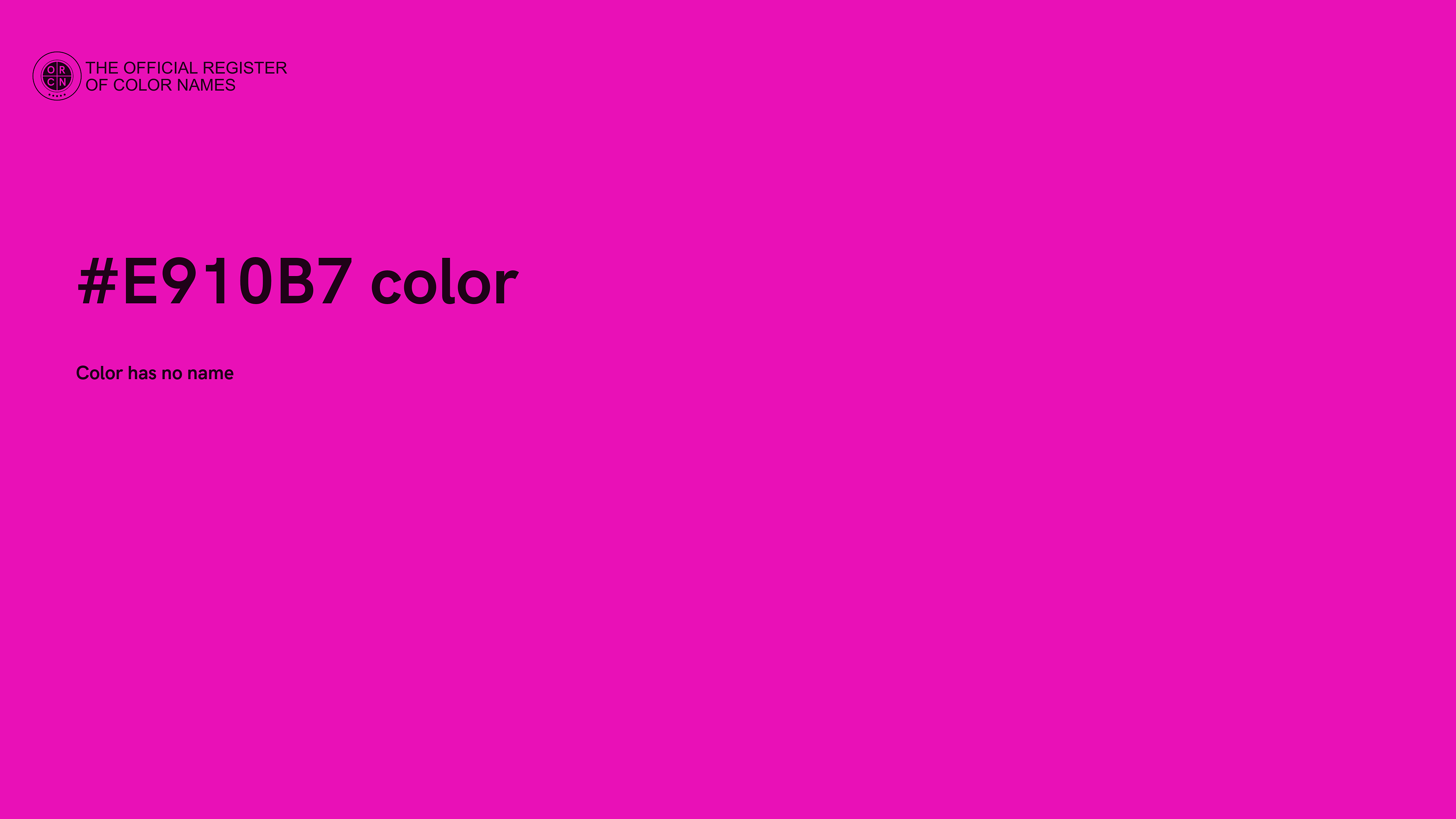 HEX code #E910B7 represent the color in hexadecimal format by combining three values – the amounts of Red, Green and Blue (RGB). Its RGB composition is 233, 16, 183 ( rgb(233, 16, 183) ), which breaks down into 91.4% of Red, 6.3% Green and 71.8% Blue.