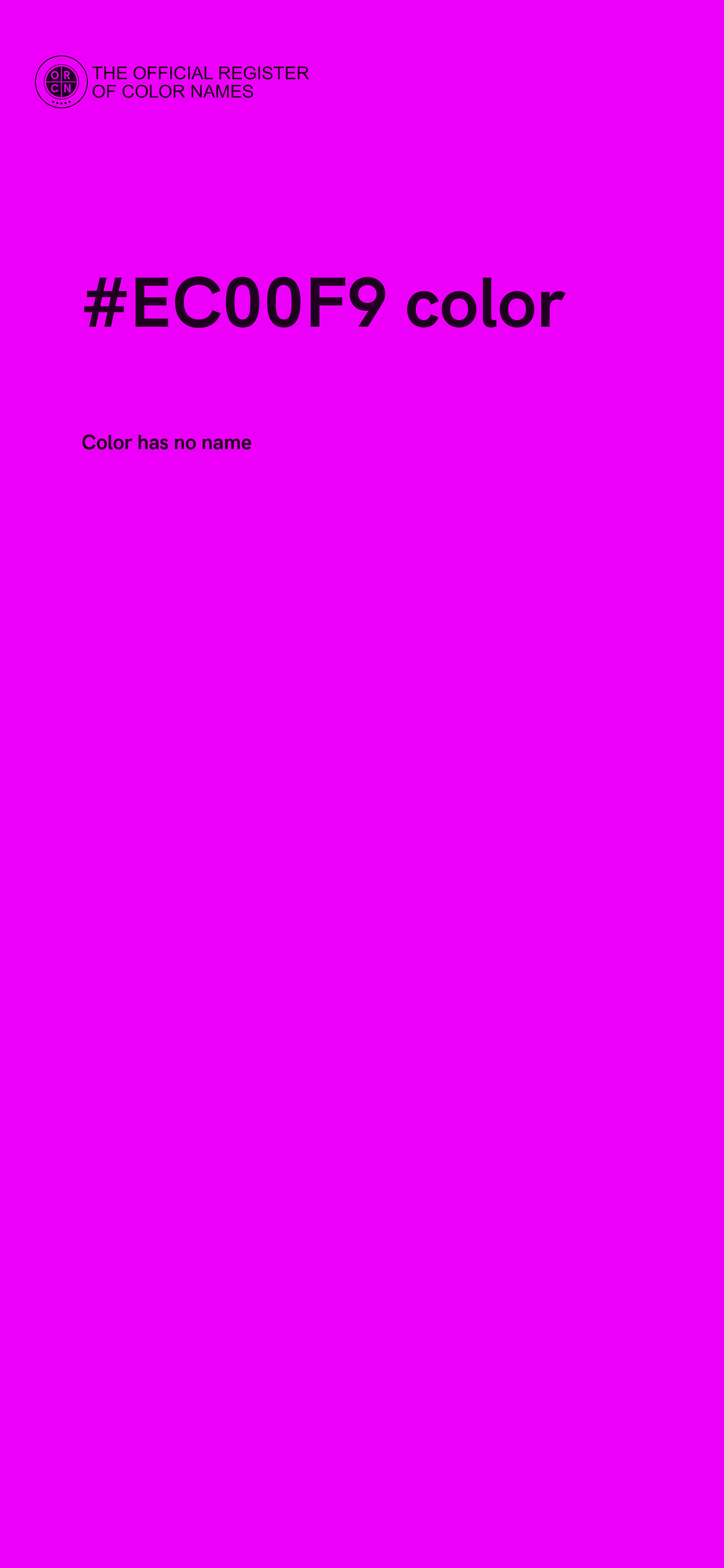 For printing in non digital world, #EC00F9 is represented in CMYK as 5 Cyan, 98 Magenta, 0 Yellow, and 2 Black (Key) (C:5 M:98 Y:0 K:2).