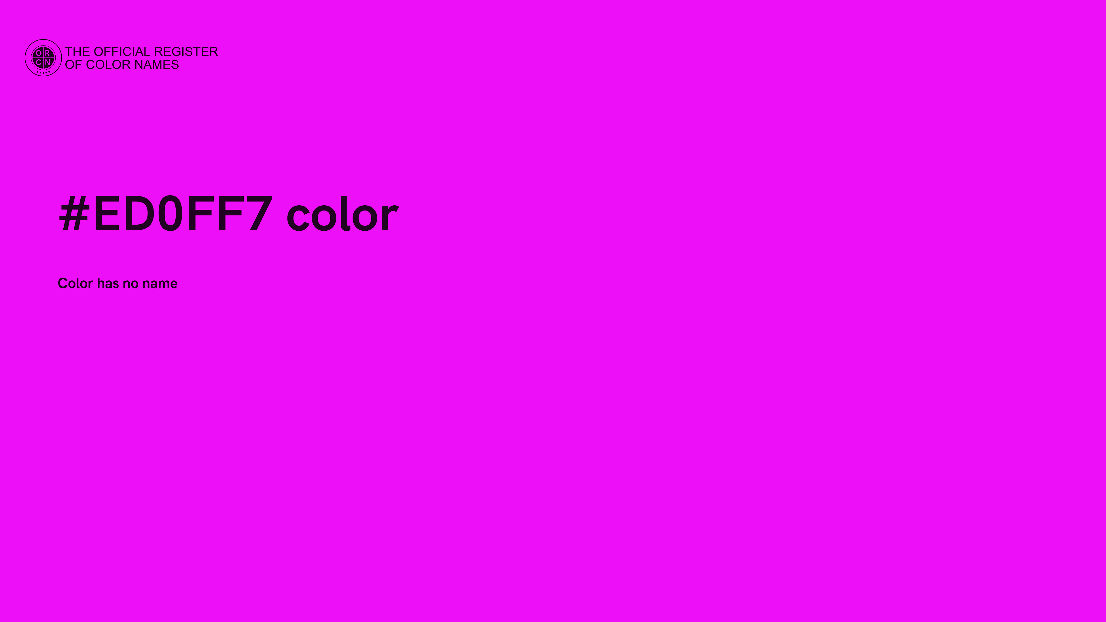 HEX code #ED0FF7 represent the color in hexadecimal format by combining three values – the amounts of Red, Green and Blue (RGB). Its RGB composition is 237, 15, 247 ( rgb(237, 15, 247) ), which breaks down into 92.9% of Red, 5.9% Green and 96.9% Blue.