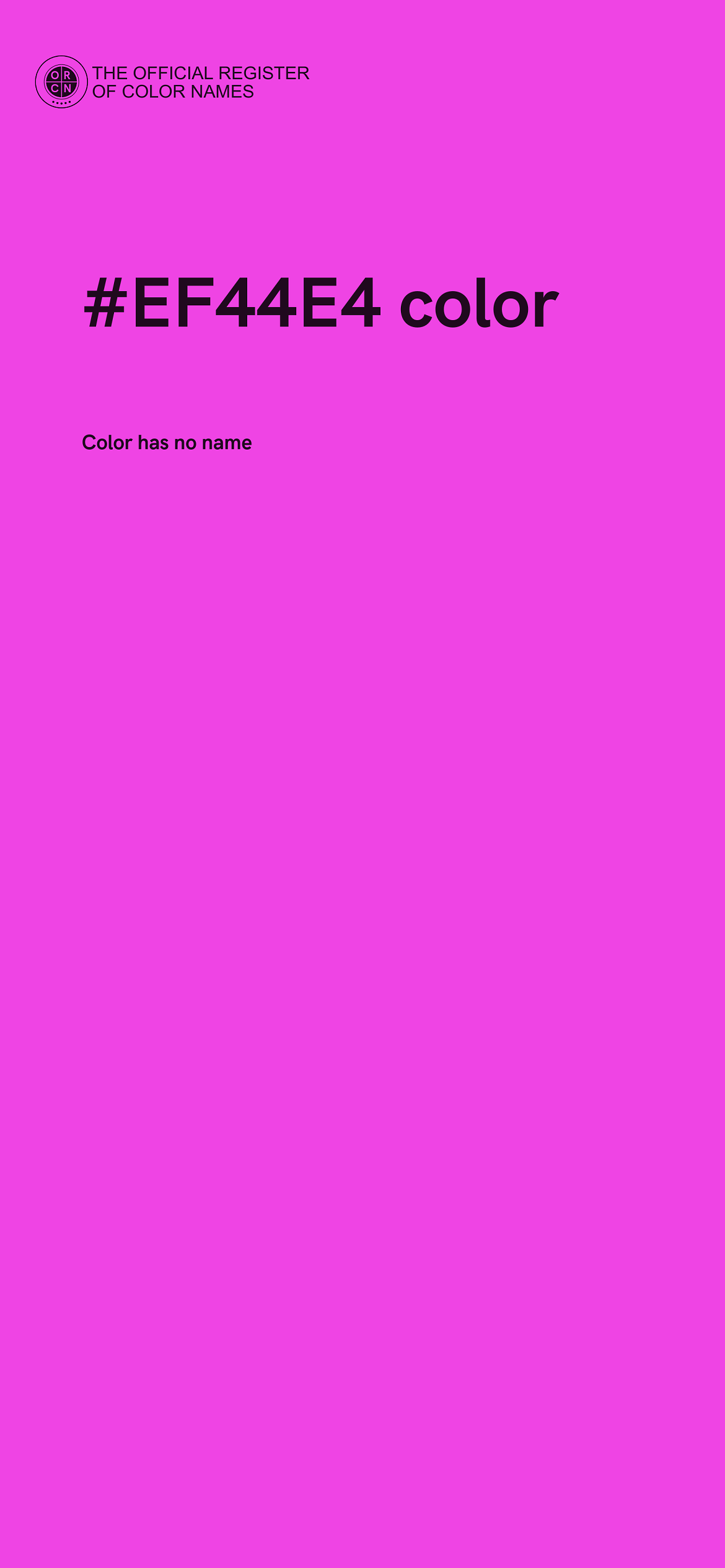 For printing in non digital world, #EF44E4 is represented in CMYK as 0 Cyan, 67 Magenta, 4 Yellow, and 6 Black (Key) (C:0 M:67 Y:4 K:6).