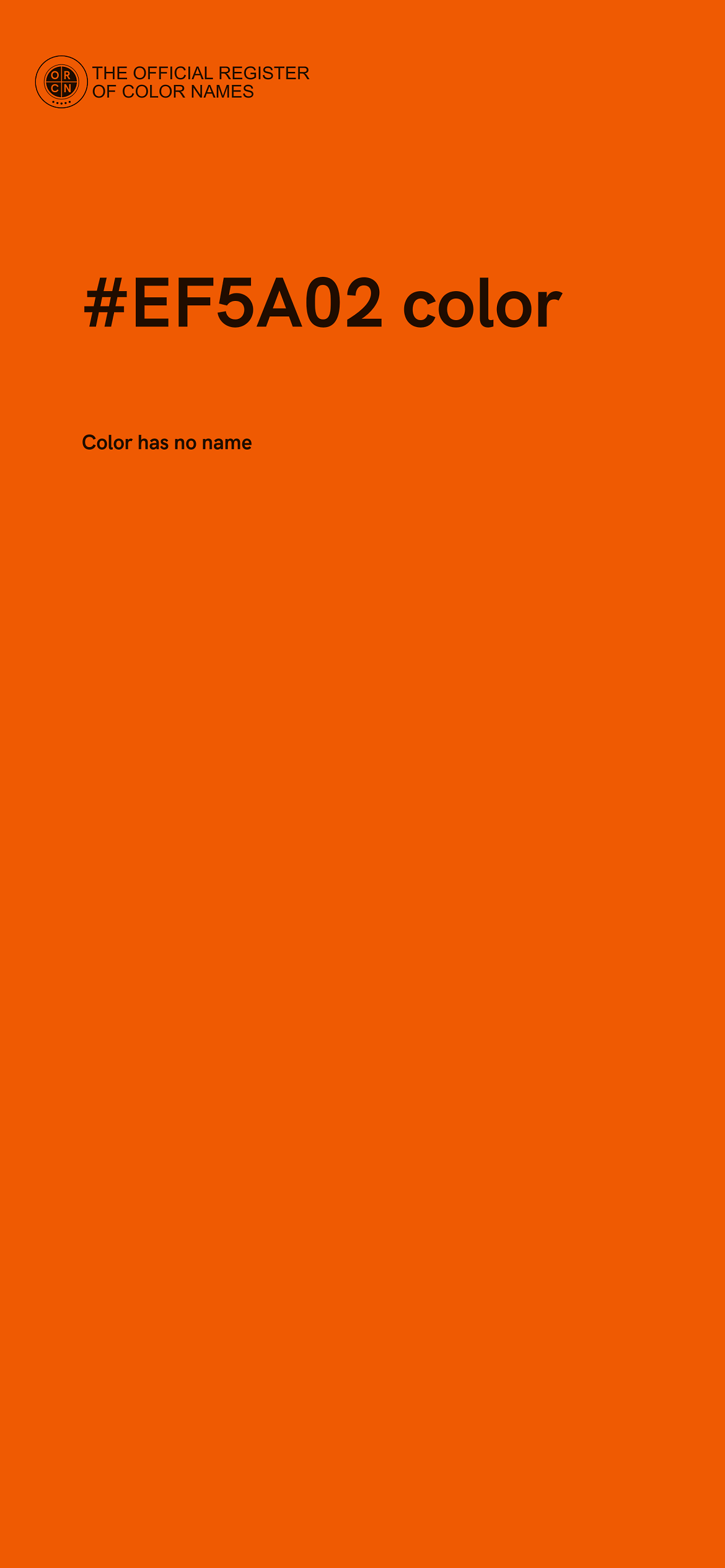 The digital color HEX #EF5A02 belongs to the Orange Color Family featuring Full Saturation (Saturation Family) and Light (Brightness Family).