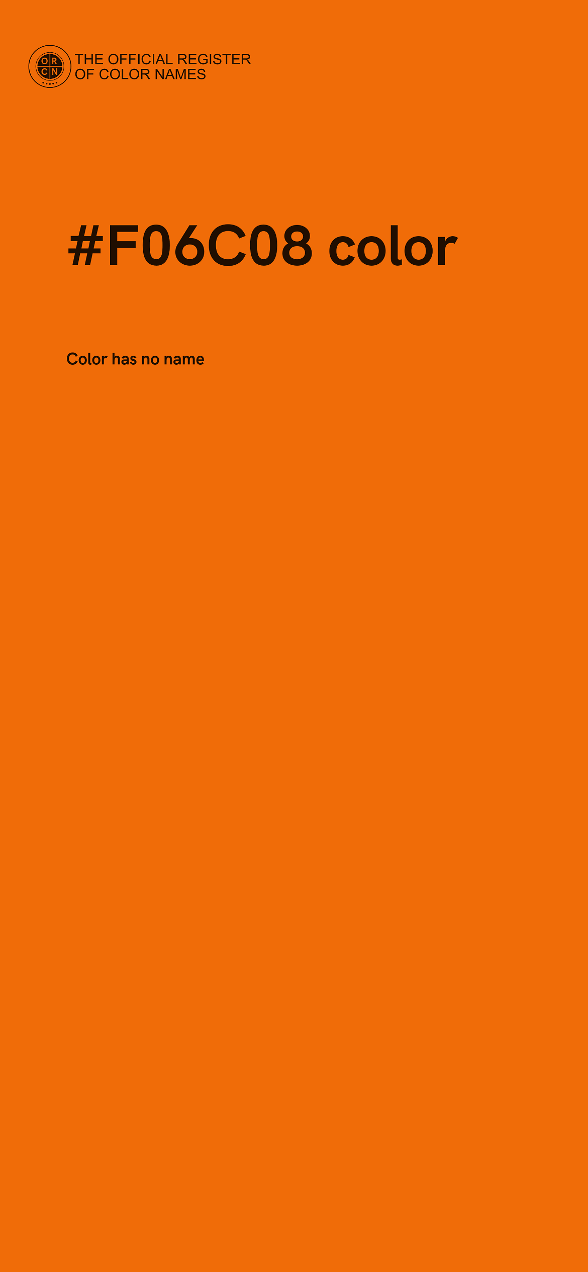 The digital color HEX #F06C08 belongs to the Orange Color Family featuring Full Saturation (Saturation Family) and Light (Brightness Family).