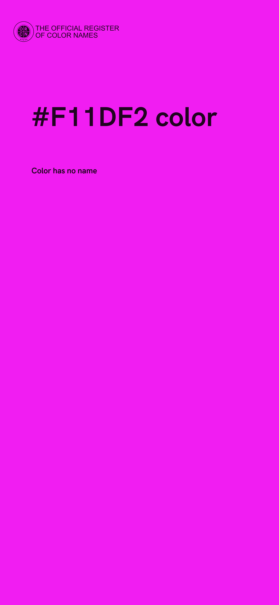 The digital color HEX #F11DF2 belongs to the Magenta Color Family featuring Full Saturation (Saturation Family) and Light (Brightness Family).
