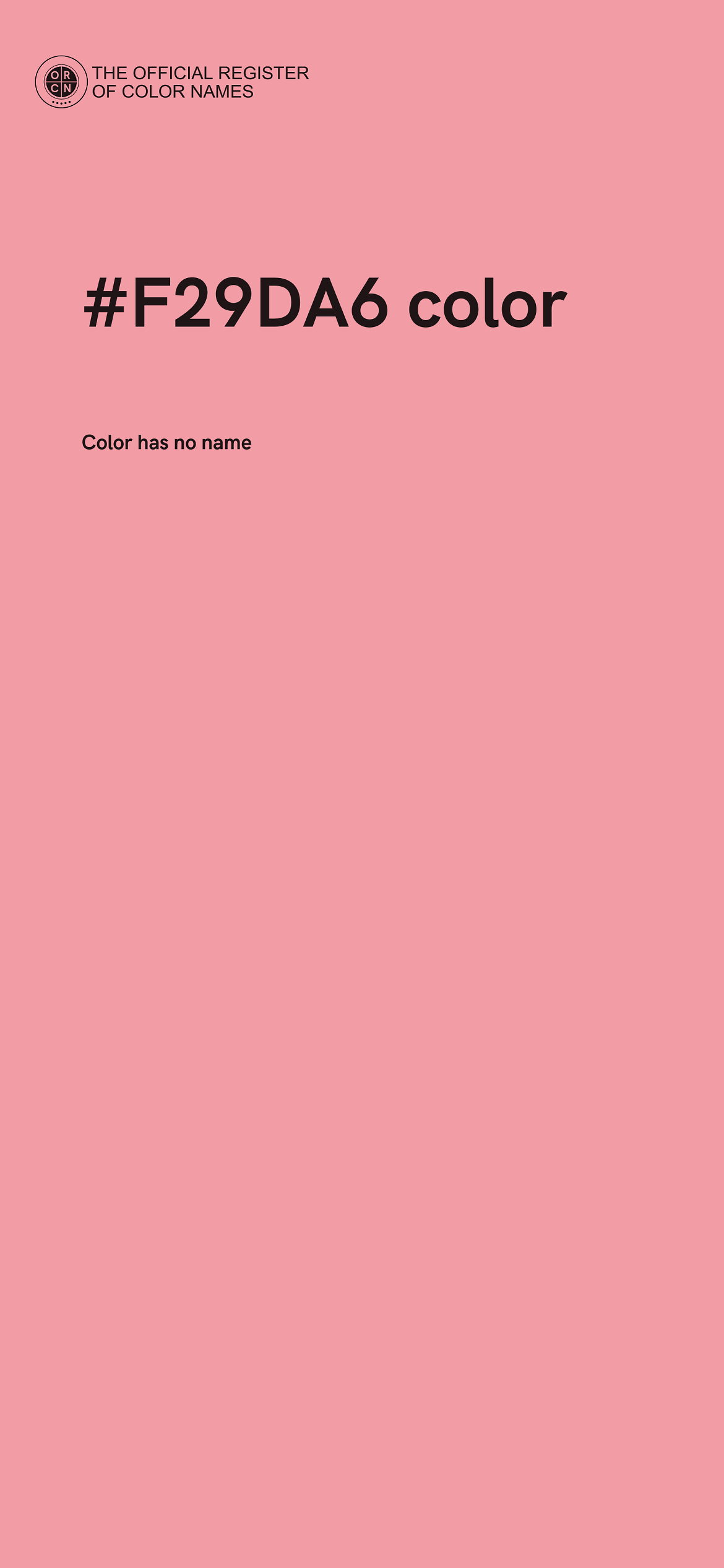 The digital color HEX #F29DA6 belongs to the Red Color Family featuring High Saturation (Saturation Family) and Very Light (Brightness Family).