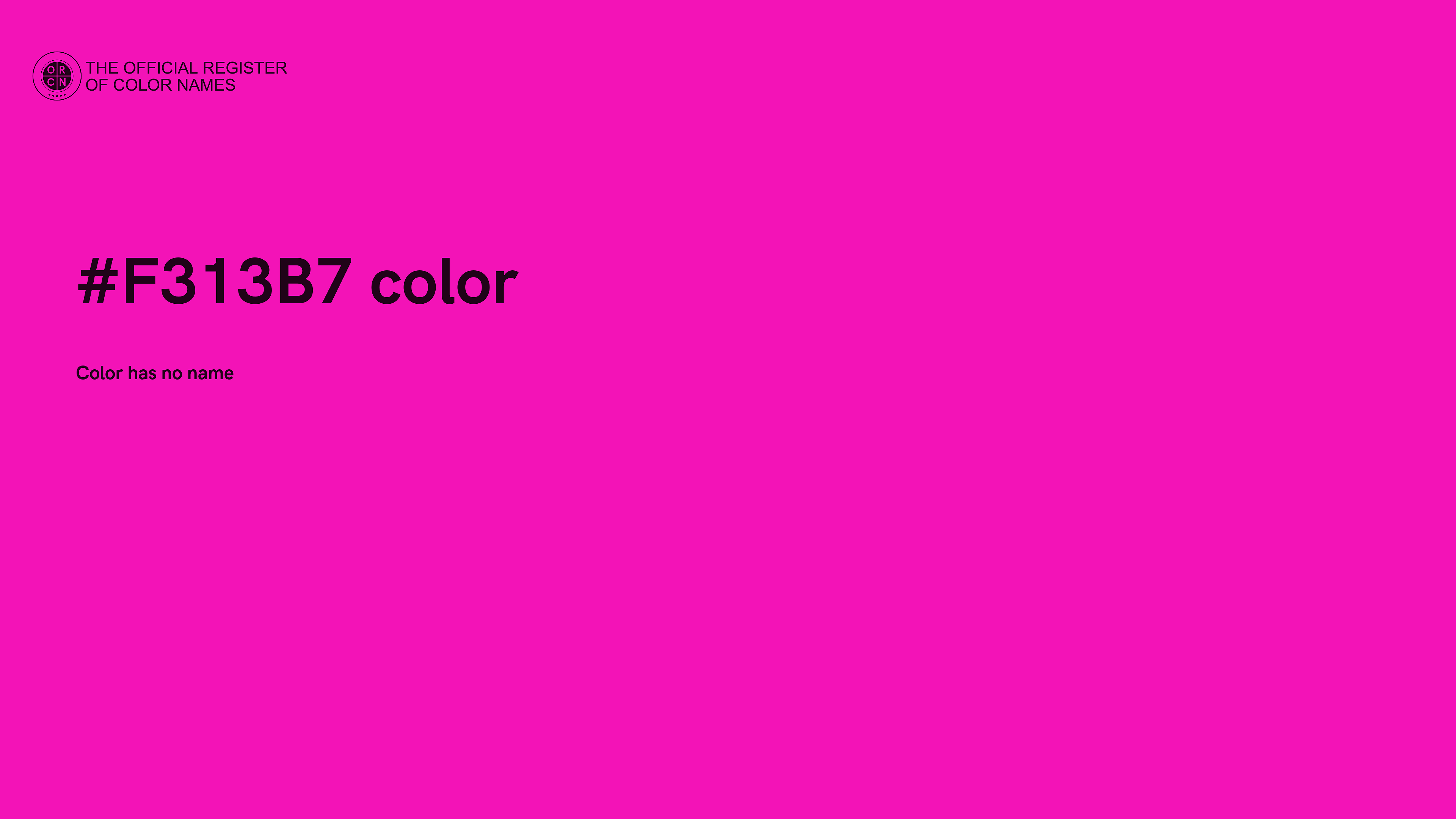 HEX code #F313B7 represent the color in hexadecimal format by combining three values – the amounts of Red, Green and Blue (RGB). Its RGB composition is 243, 19, 183 ( rgb(243, 19, 183) ), which breaks down into 95.3% of Red, 7.5% Green and 71.8% Blue.